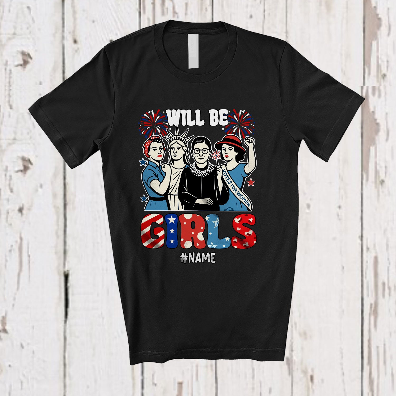 Personalized Custom Name Will Be Girls Patriotic; Joyful 4th of July Liberty Feminist Women; Patriotic T-Shirt. This cotton t-shirt is a durable staple product with a classic fit. One of the most popular items, it has a relaxed style made for everyday and casual wear.