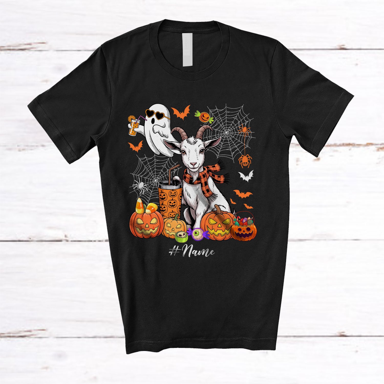Personalized Custom Name Witch Goat Boo Drinking Coffee; Joyful Halloween Goat Farm Farmer T-Shirt. This cotton t-shirt is a durable staple product with a classic fit. One of the most popular items, it has a relaxed style made for everyday and casual wear.