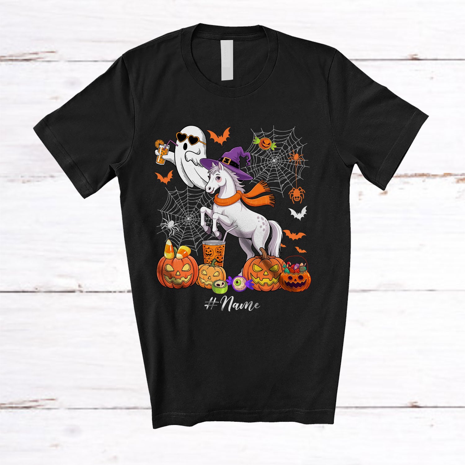 Personalized Custom Name Witch Horse Boo Drinking Coffee; Joyful Halloween Horse Farm Farmer T-Shirt. This cotton t-shirt is a durable staple product with a classic fit. One of the most popular items, it has a relaxed style made for everyday and casual wear.