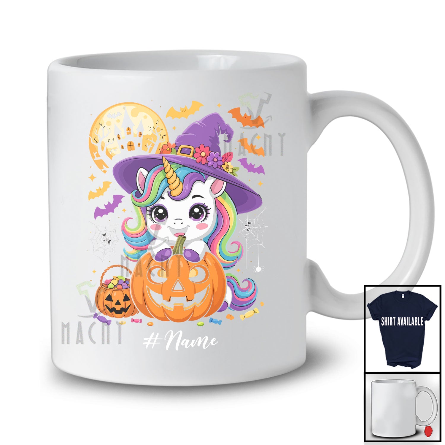 • Personalized Custom Name Witch Unicorn Holding Carved Pumpkin; Lovely Halloween Moon Family T-Shirt. This cotton t-shirt is a durable staple product with a classic fit. One of the most popular items, it has a relaxed style made for everyday and casual wear.