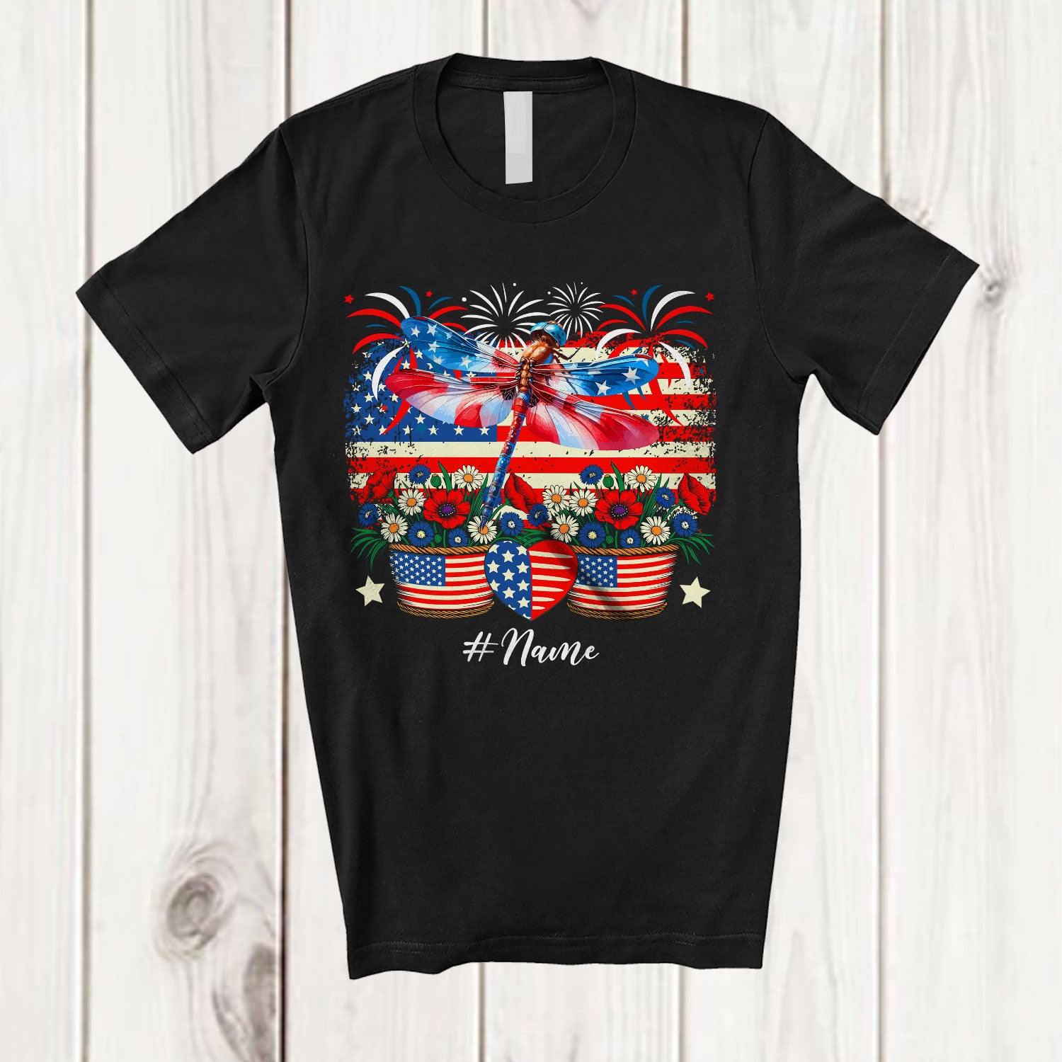 Personalized Dragonfly Flowers American Flag; Lovely 4th Of July Custom Name Patriotic T-Shirt