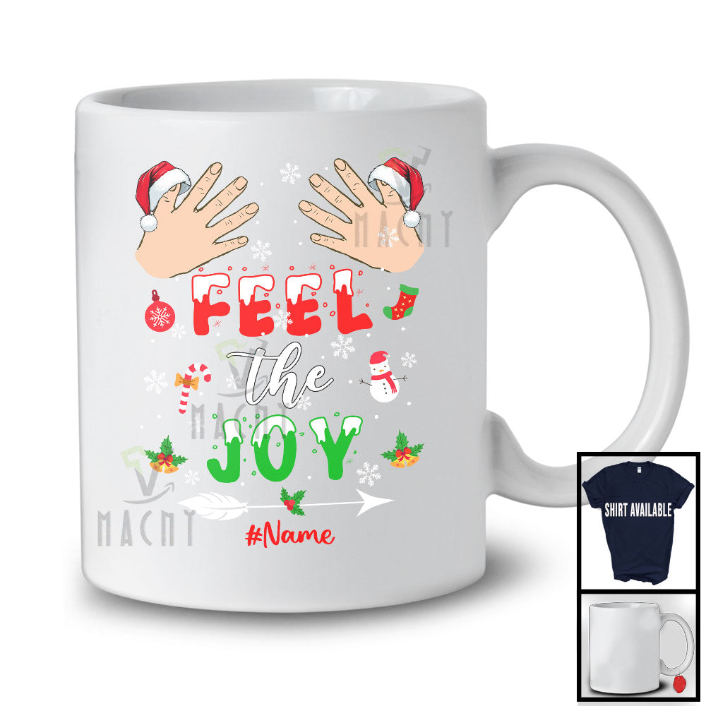 • Personalized Feel The Joy; Awesome Christmas Adult Santa Snowing; X-mas Custom Name Couple T-Shirt. This cotton t-shirt is a durable staple product with a classic fit. One of the most popular items, it has a relaxed style made for everyday and casual wear.