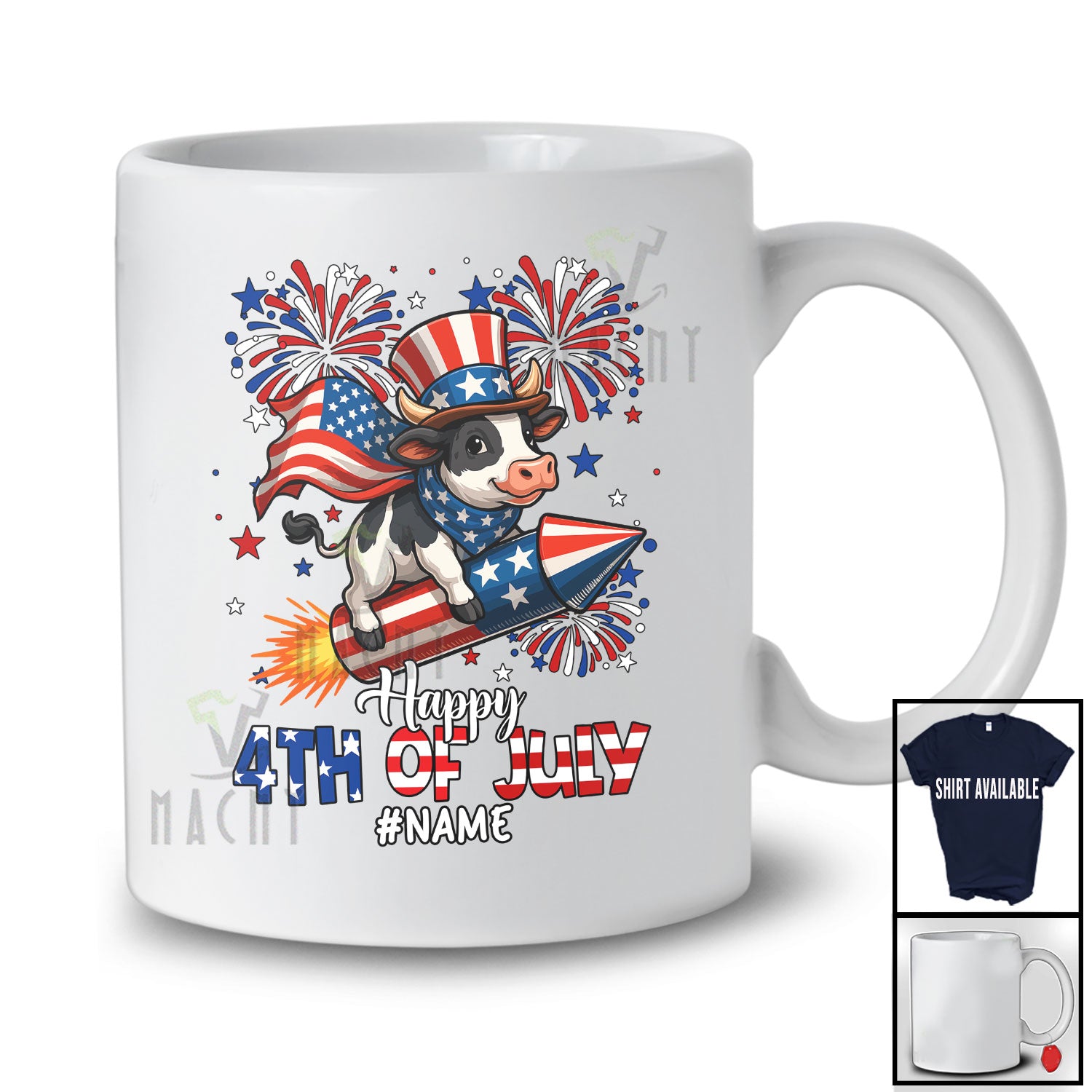 Personalized Happy 4th Of July; Amusing Custom Name Cow Riding Firecracker; Patriotic Farmer T-Shirt. This cotton t-shirt is a durable staple product with a classic fit. One of the most popular items, it has a relaxed style made for everyday and casual wear.