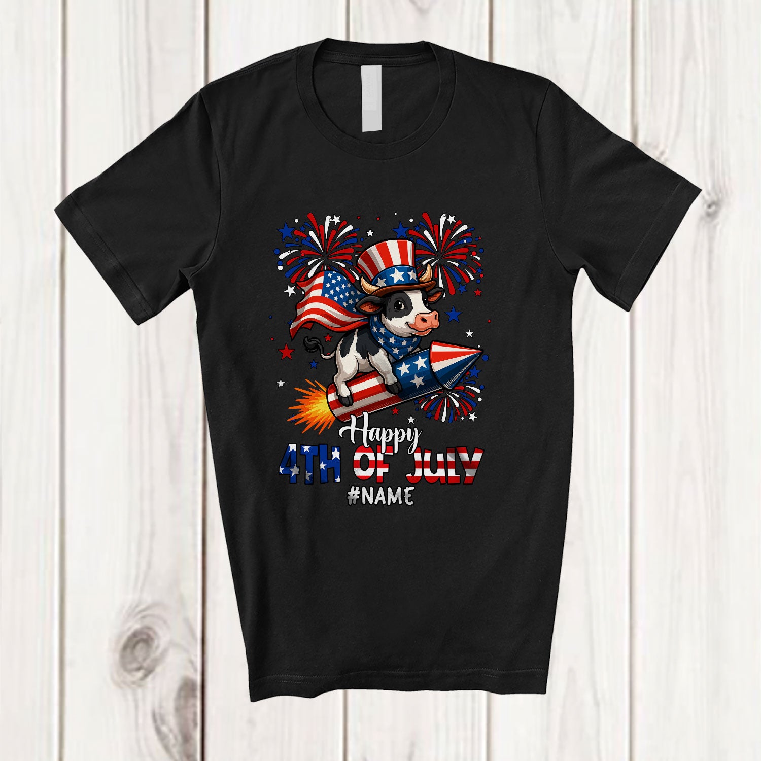Personalized Happy 4th Of July; Amusing Custom Name Cow Riding Firecracker; Patriotic Farmer T-Shirt