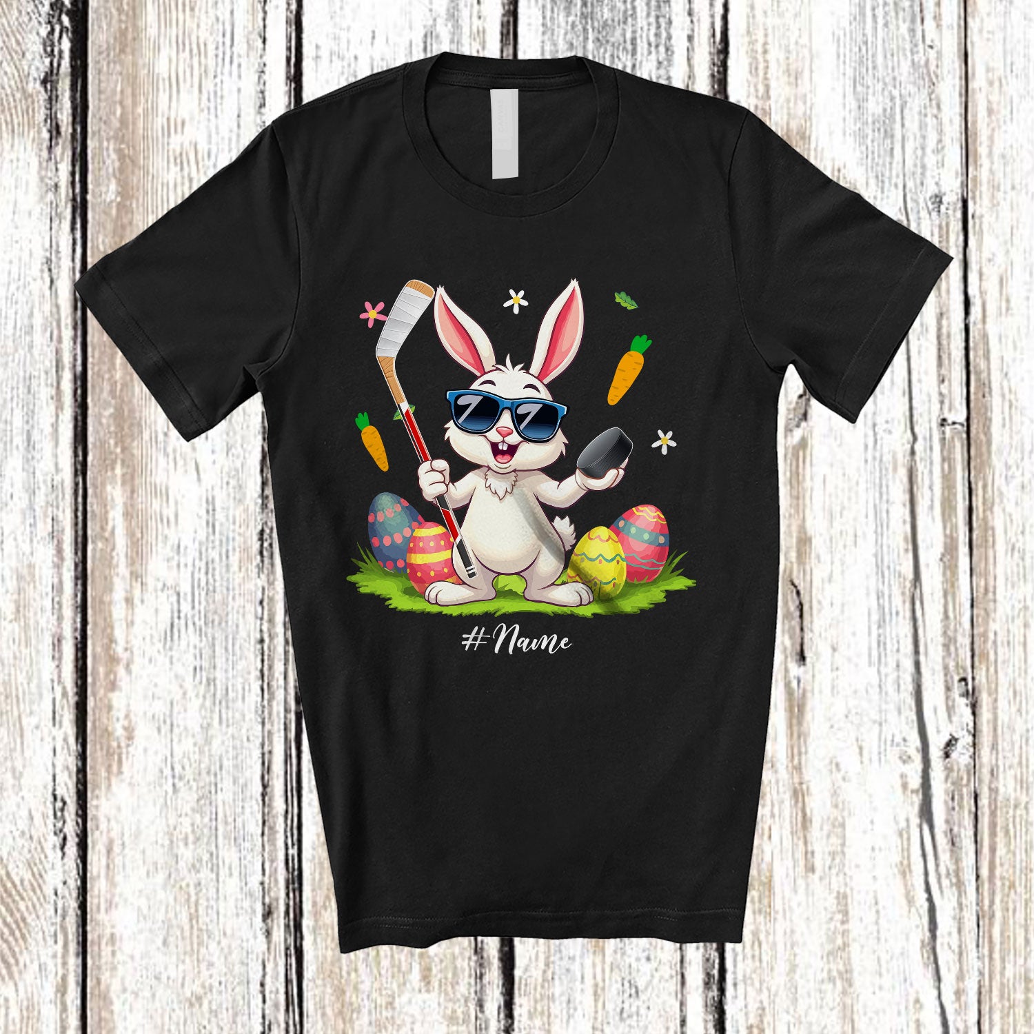 Personalized Happy Easter; Joyful Bunny Playing Hockey; Custom Name Player Egg Hunting T-Shirt