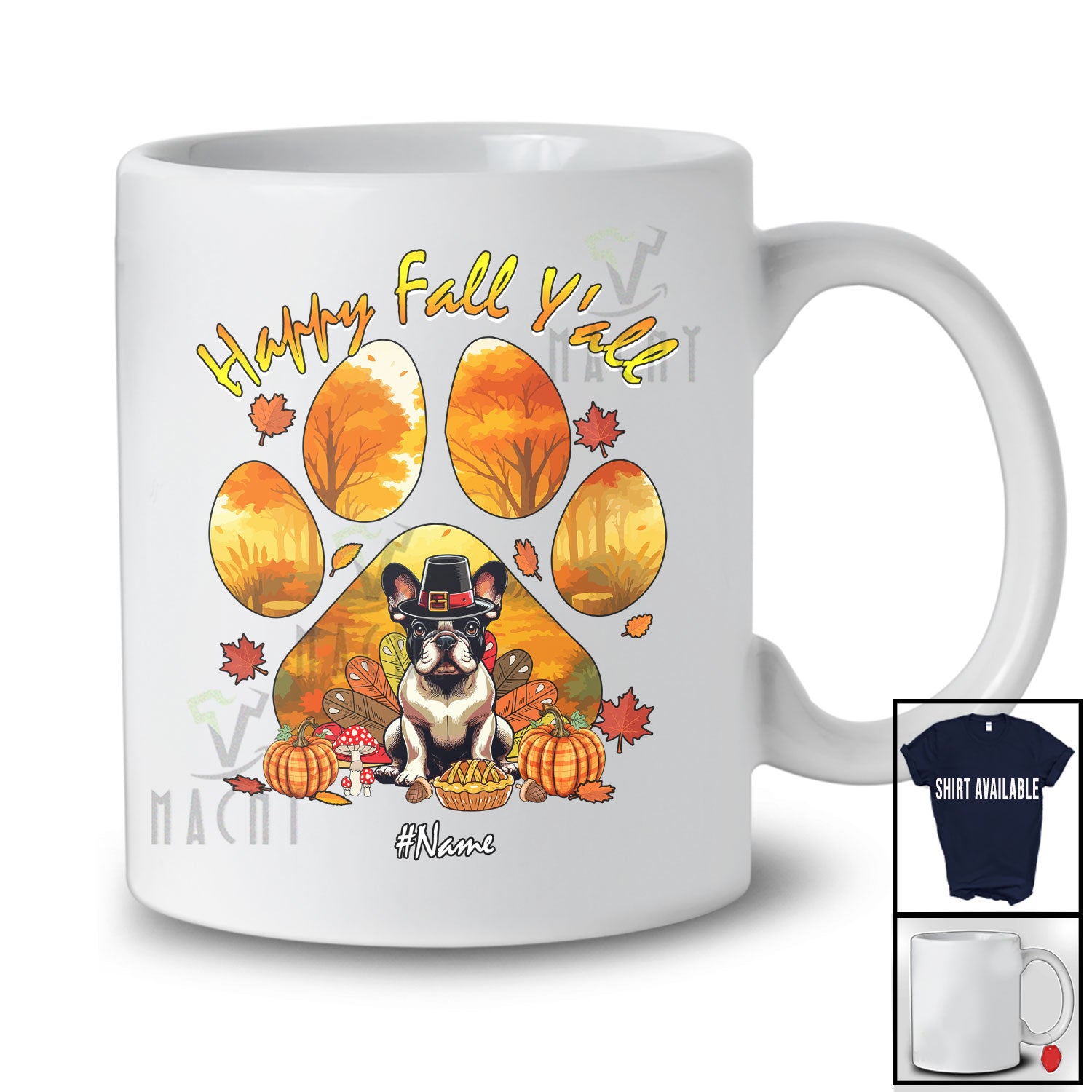 Personalized Happy Fall Y'all; Lovely Thanksgiving Custom Name Turkey French Bulldog Paws T-Shirt. This cotton t-shirt is a durable staple product with a classic fit. One of the most popular items, it has a relaxed style made for everyday and casual wear.