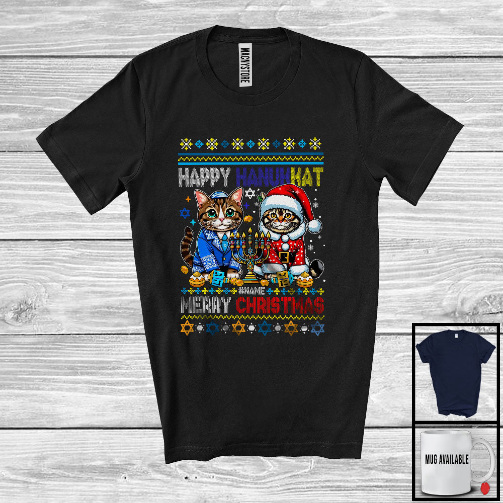 Personalized Happy Hanukkat Merry Christmas; Lovely Sweater Custom Name Cat; Menorah Family T-Shirt