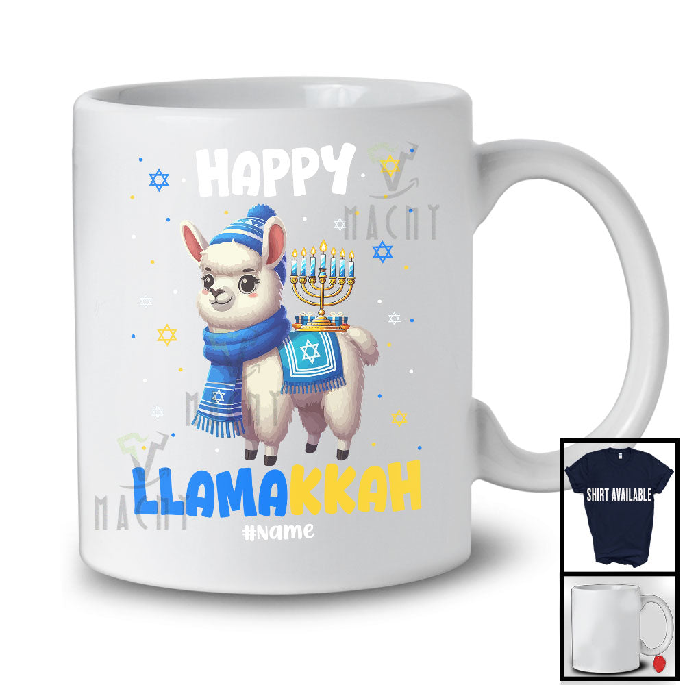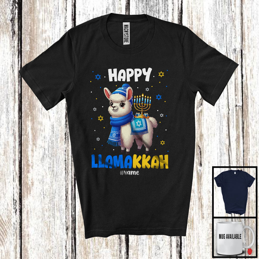• Personalized Happy Llamakkah; Lovely Hanukkah Menorah On Llama; Custom Name Family T-Shirt. This cotton t-shirt is a durable staple product with a classic fit. One of the most popular items, it has a relaxed style made for everyday and casual wear.