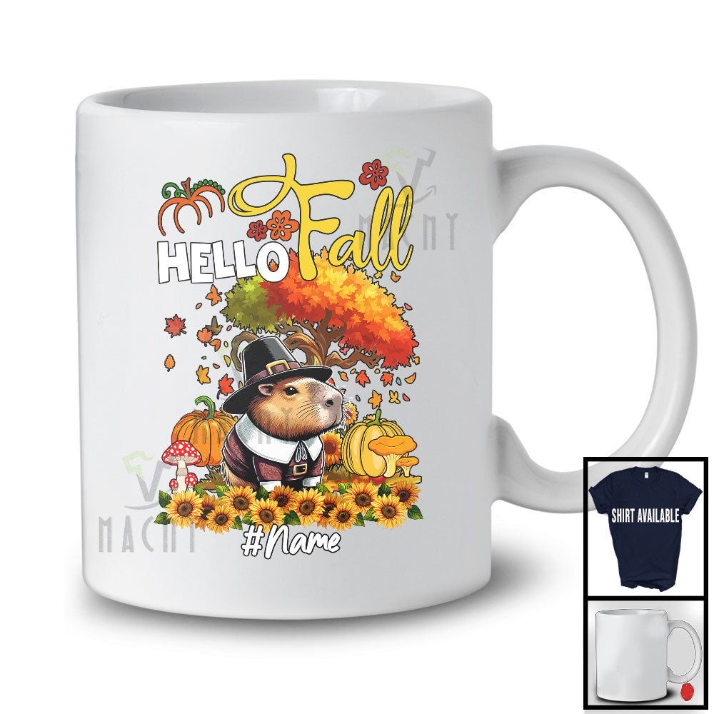The Personalized Hello Fall; Lovely Thanksgiving Tree Pilgrim Capybara; Custom Name Animal Lover T-Shirt destined to impress, and priced at only $12.95, for a limited time.