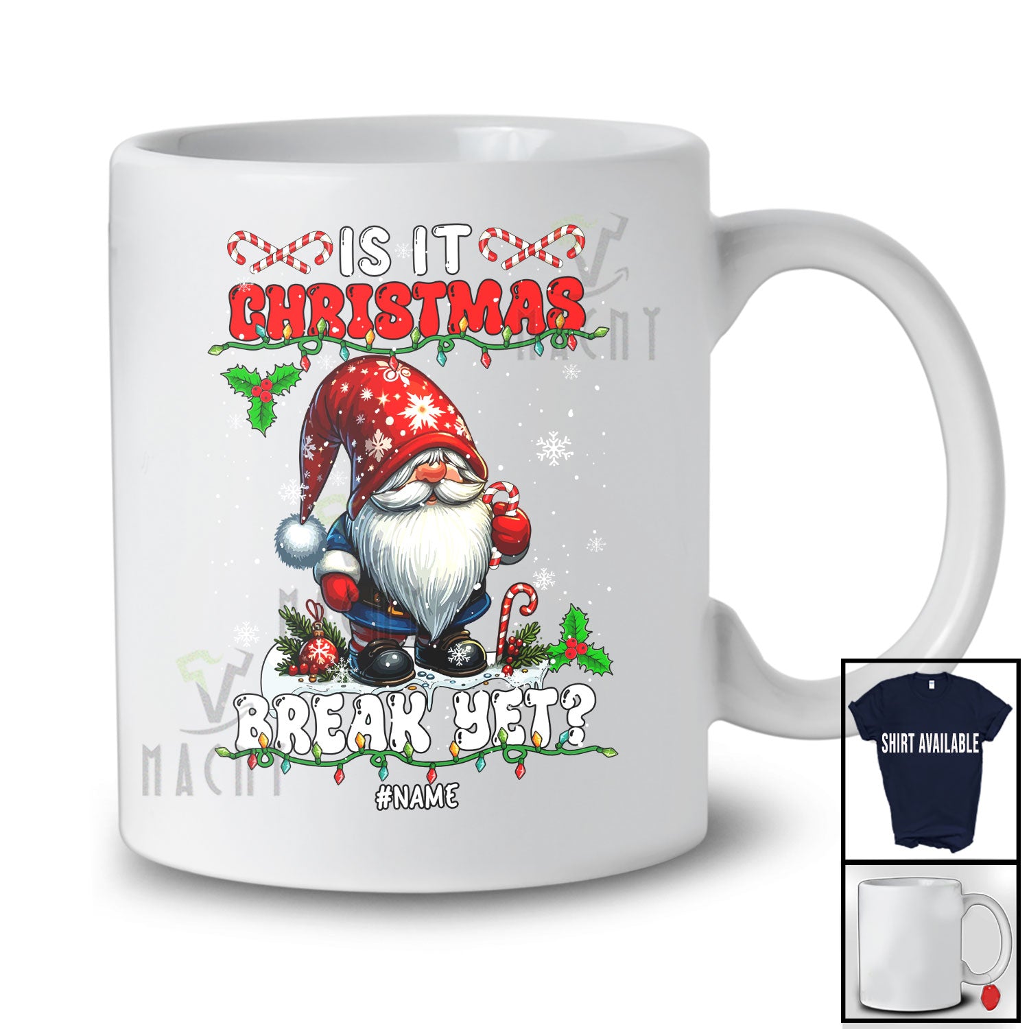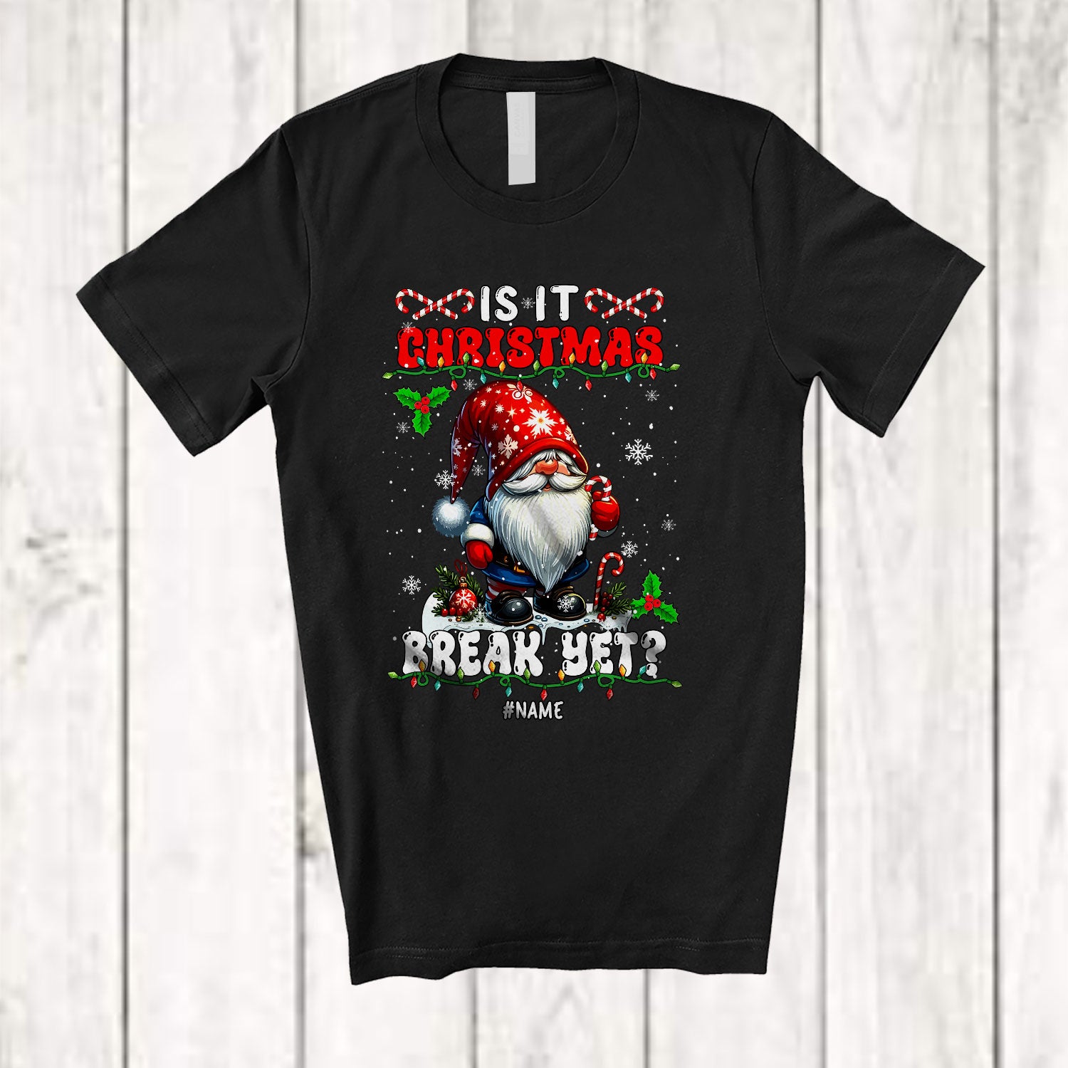 Personalized Is It Christmas Break Yet; Joyful X-mas Lights Gnome; Vacation Custom Name Teacher T-Shirt. This cotton t-shirt is a durable staple product with a classic fit. One of the most popular items, it has a relaxed style made for everyday and casual wear.