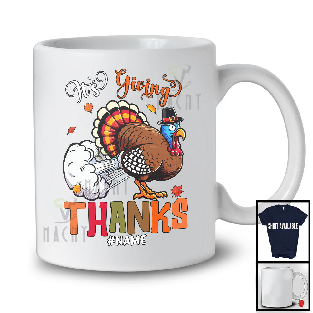 • Personalized It's Giving Thanks; Sarcastic Thanksgiving Custom Name Turkey Farting; Dinner Family T-Shirt. This cotton t-shirt is a durable staple product with a classic fit. One of the most popular items, it has a relaxed style made for everyday and casual wear.