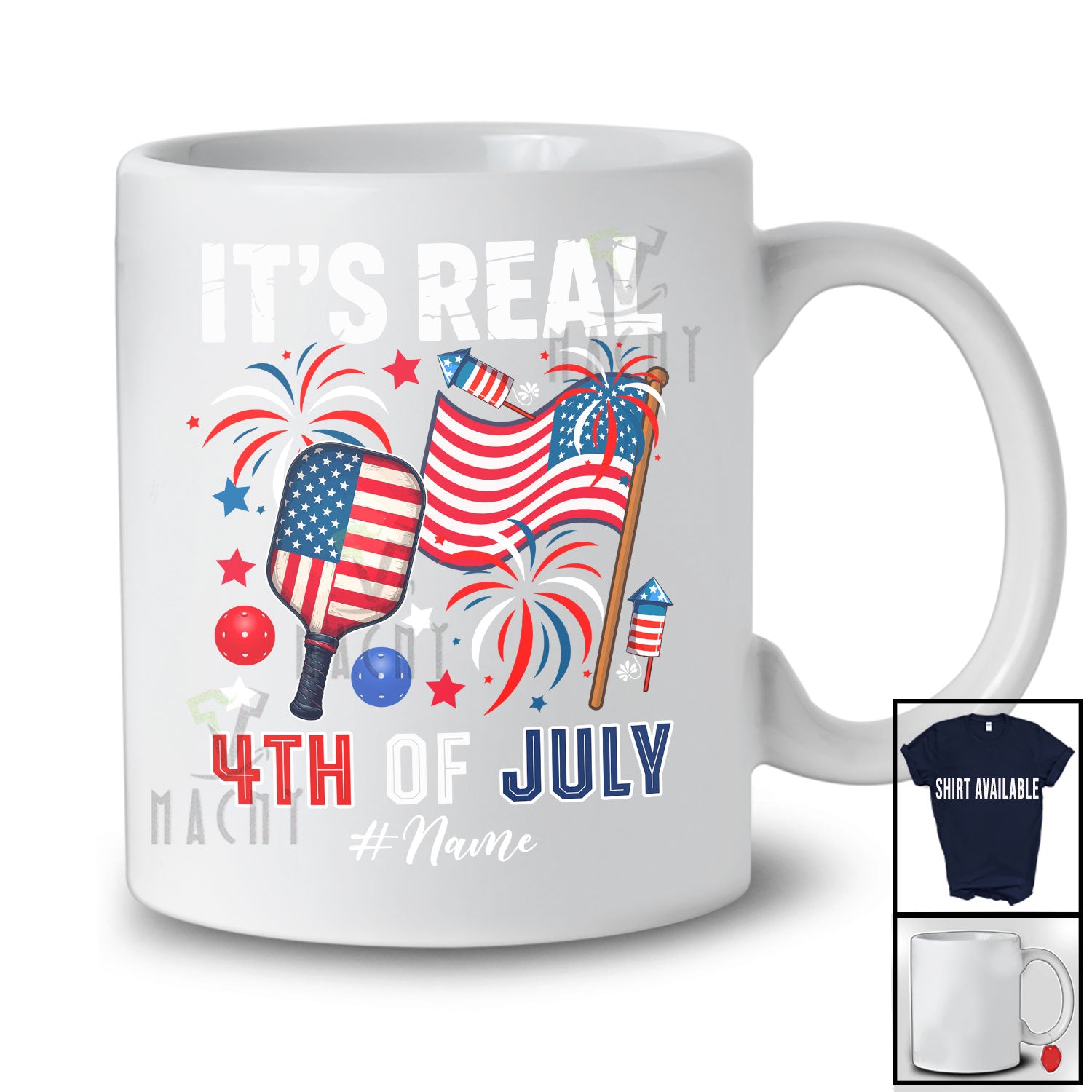 Personalized It's Real 4th of July; Amusing Custom Name Pickleball Tools Player US Flag; Patriotic T-Shirt. This cotton t-shirt is a durable staple product with a classic fit. One of the most popular items, it has a relaxed style made for everyday and casual wear.