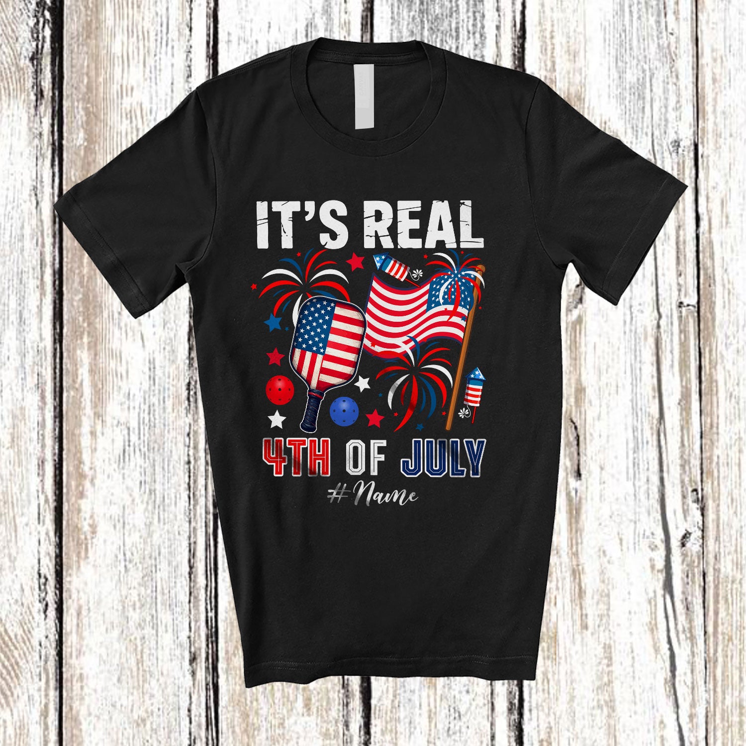 Personalized It's Real 4th of July; Amusing Custom Name Pickleball Tools Player US Flag; Patriotic T-Shirt