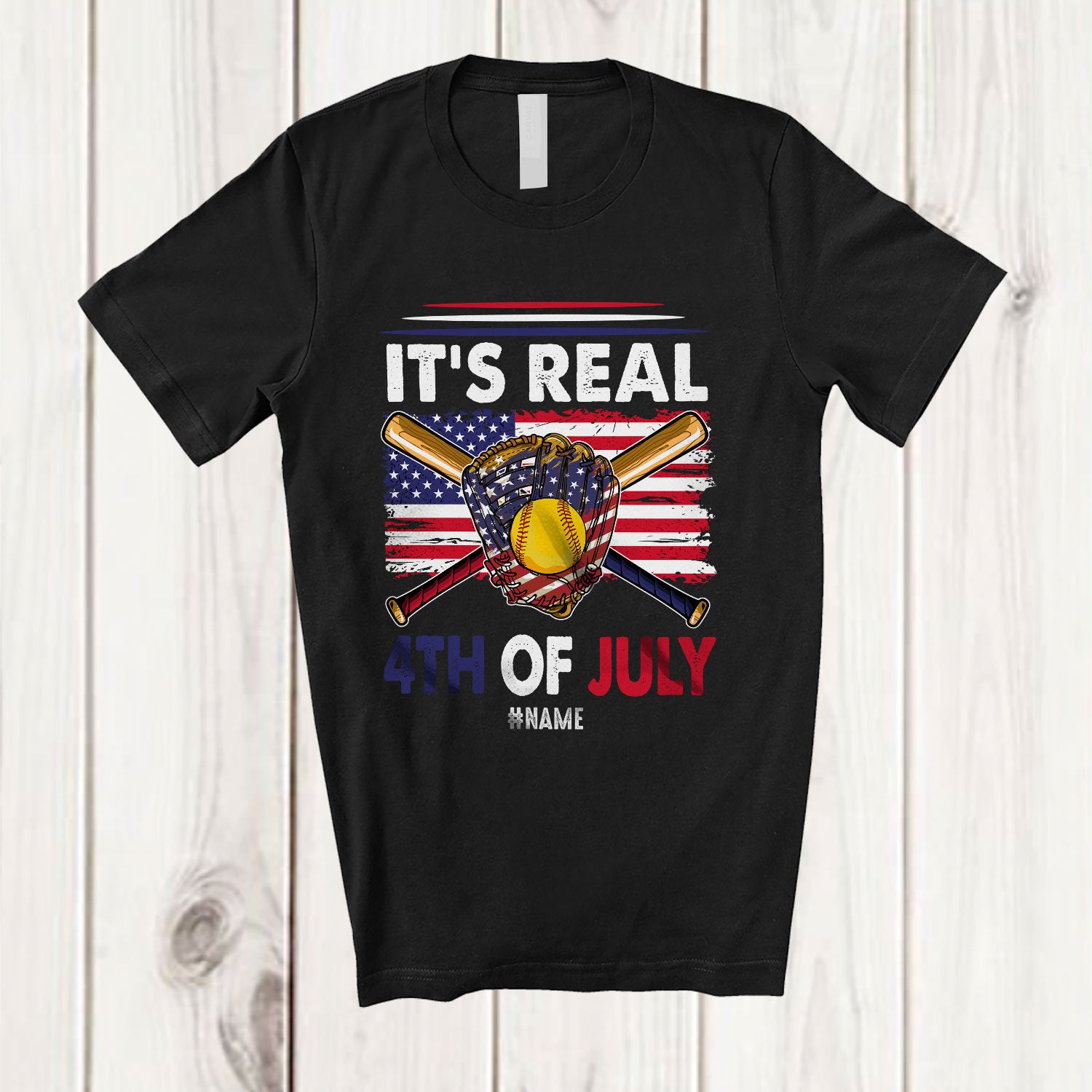 Personalized It's Real 4th of July; Joyful Custom Name Player Softball Tools; US Flag Patriotic T-Shirt. This cotton t-shirt is a durable staple product with a classic fit. One of the most popular items, it has a relaxed style made for everyday and casual wear.