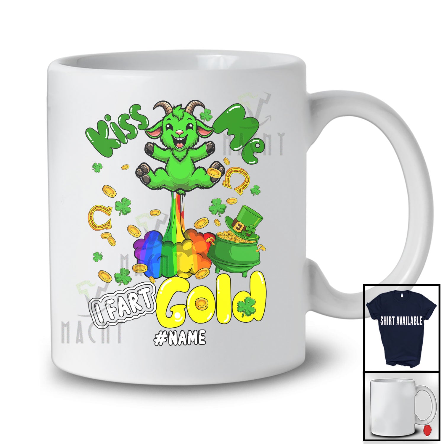 Personalized Kiss Me I Fart Gold; Humorous St. Patrick's Day Custom Name Goat; Irish Shamrocks T-Shirt. This cotton t-shirt is a durable staple product with a classic fit. One of the most popular items, it has a relaxed style made for everyday and casual wear.