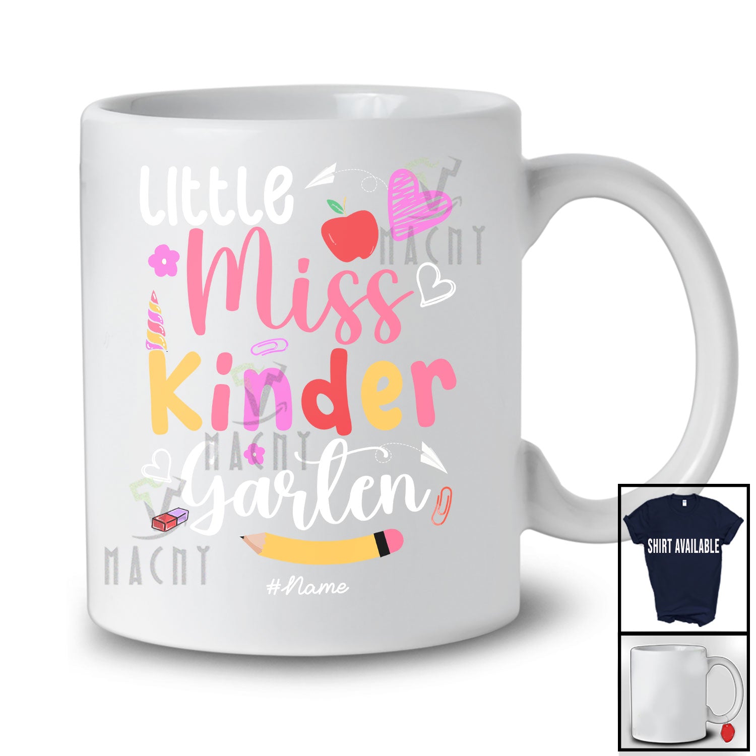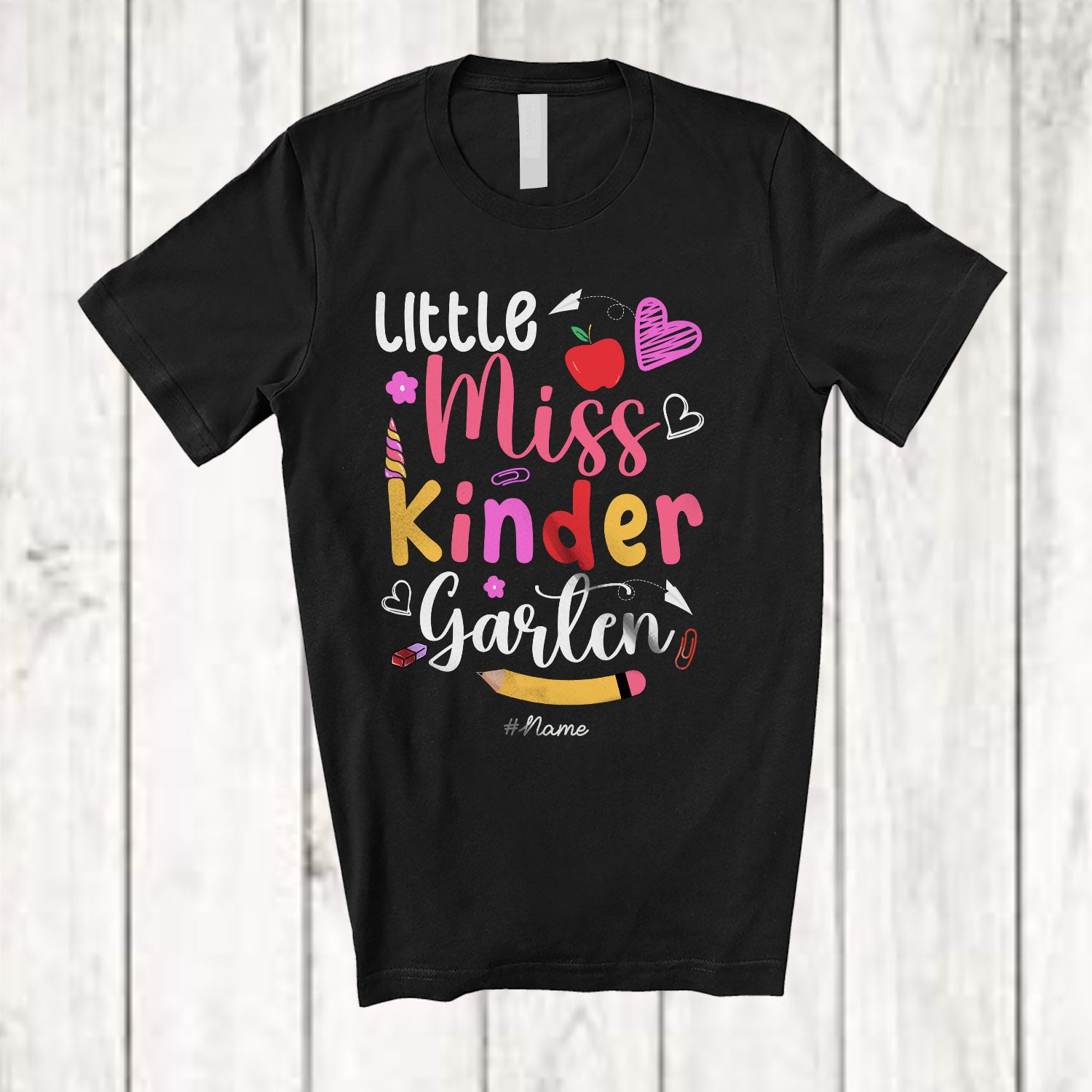 Personalized Little Miss Kindergarten; Lovely First Day Of School Custom Name Kindergarten Students T-Shirt. This cotton t-shirt is a durable staple product with a classic fit. One of the most popular items, it has a relaxed style made for everyday and casual wear.