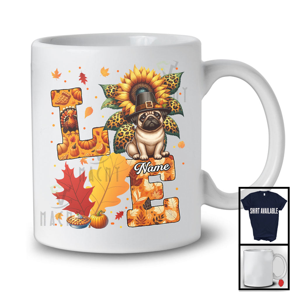 Personalized LOVE, Adorable Thanksgiving Custom Name Pug, Sunflower Fall Leaves T-Shirt
