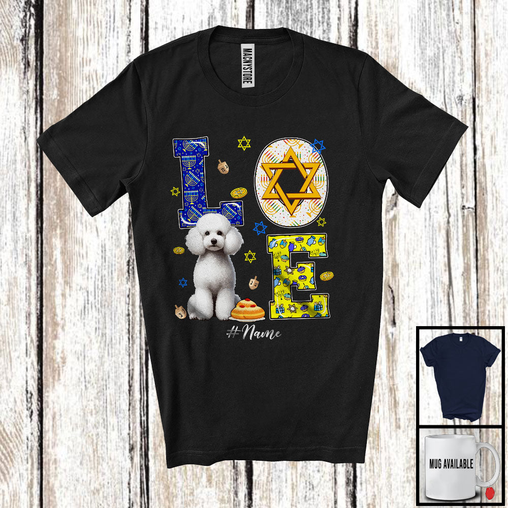 Personalized LOVE; Happy Hanukkah Decoration Custom Name Poodle Owner; Family Group T-Shirt. This cotton t-shirt is a durable staple product with a classic fit. One of the most popular items, it has a relaxed style made for everyday and casual wear.