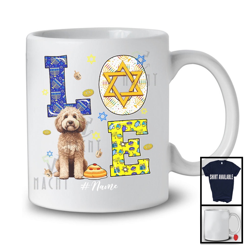 Personalized LOVE; Happy Hanukkah Decoration Custom Name Sproodle Owner; Family Group T-Shirt. This cotton t-shirt is a durable staple product with a classic fit. One of the most popular items, it has a relaxed style made for everyday and casual wear.