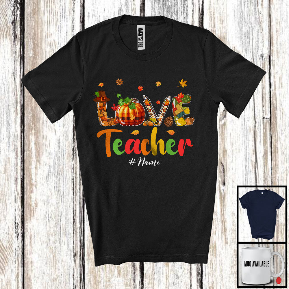 Personalized LOVE Teacher; Joyful Thanksgiving Plaid Pumpkin; Custom Name Teacher T-Shirt. This cotton t-shirt is a durable staple product with a classic fit. One of the most popular items, it has a relaxed style made for everyday and casual wear.