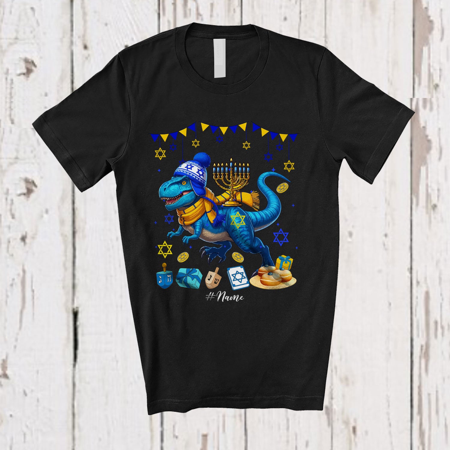 Personalized Menorah With T-Rex; Amazing Hanukkah Menorah T-Rex; Custom Name Family T-Shirt. This cotton t-shirt is a durable staple product with a classic fit. One of the most popular items, it has a relaxed style made for everyday and casual wear.