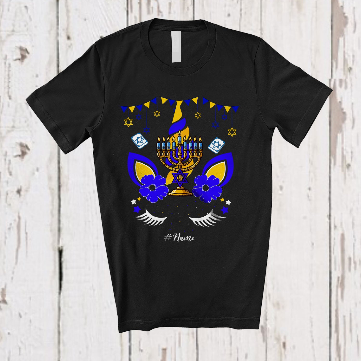 Personalized Menorah With Unicorn Face; Amazing Hanukkah Menorah Flowers; Custom Name Family T-Shirt