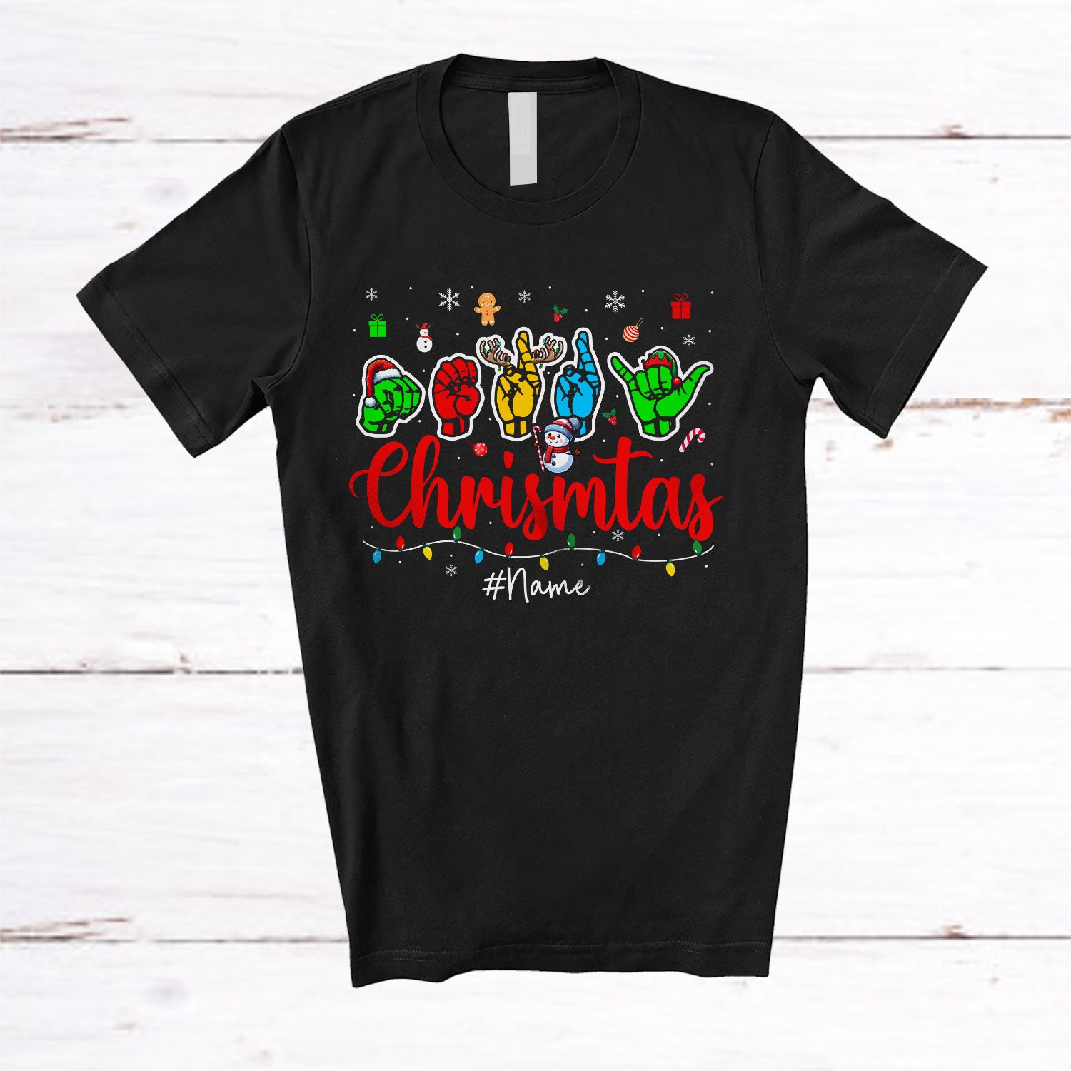 Personalized Merry Christmas ASL Sign Language; Colorful Custom Name Snowman; Family Group T-Shirt
