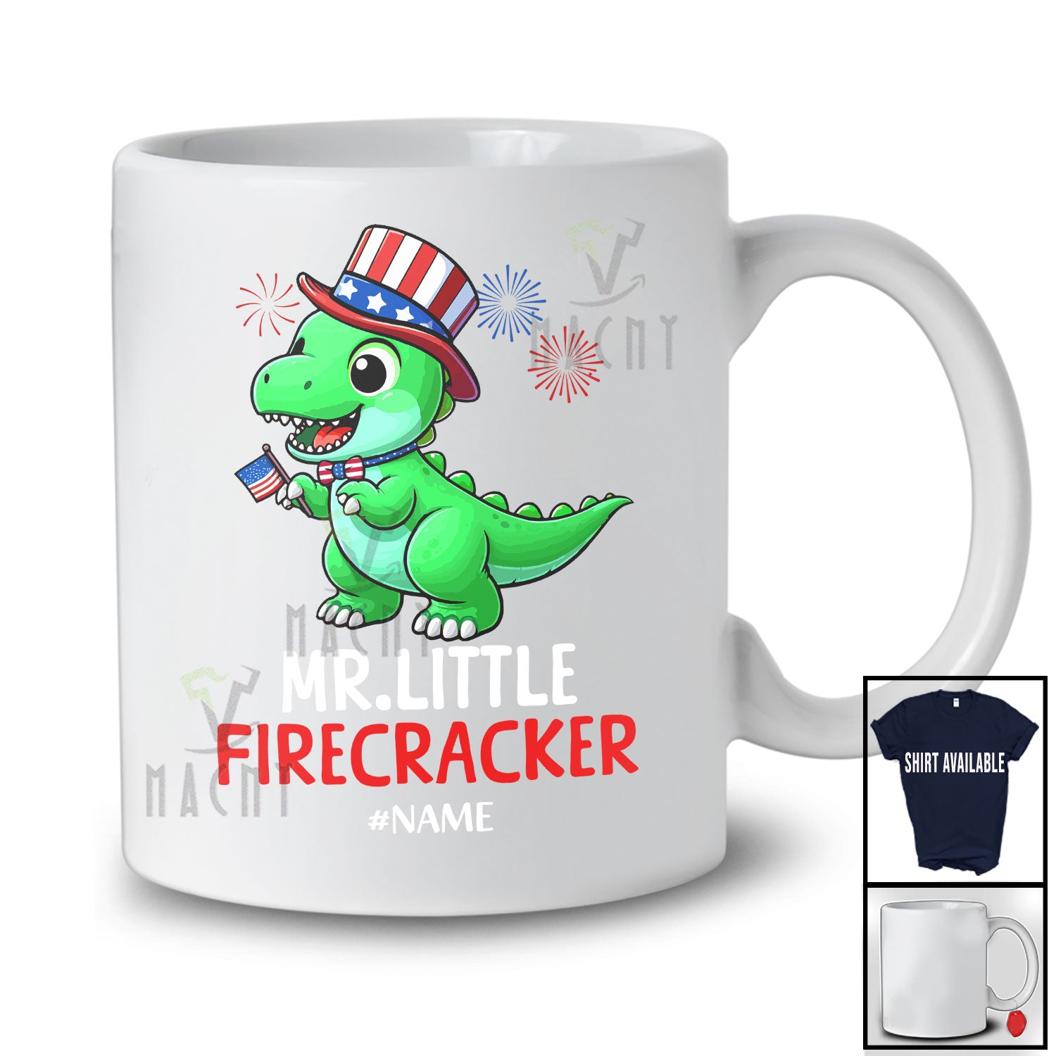 Personalized Mr. Little Firecracker; Humorous 4th Of July T-Rex; Custom Name Boys Dinosaur T-Shirt. This cotton t-shirt is a durable staple product with a classic fit. One of the most popular items, it has a relaxed style made for everyday and casual wear.