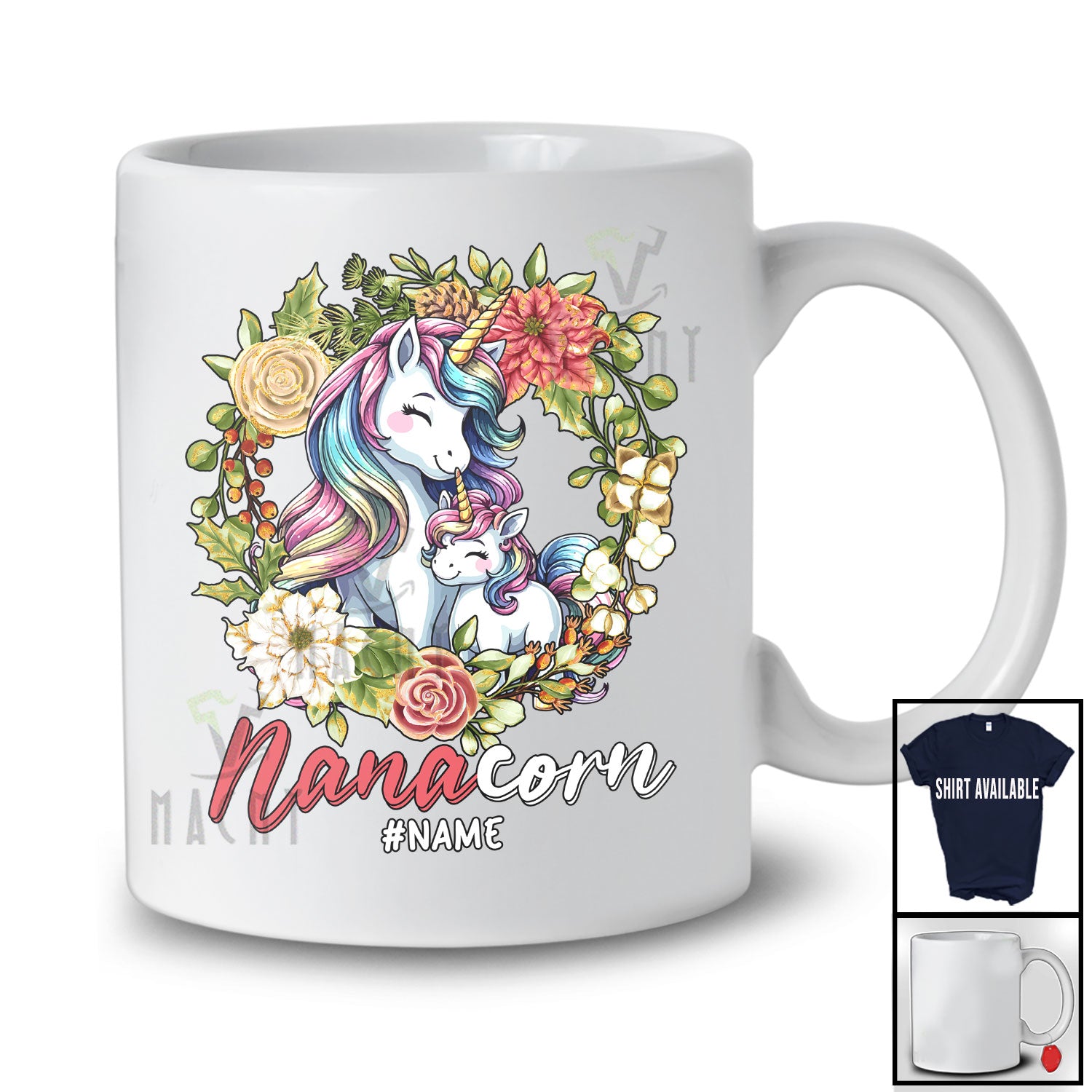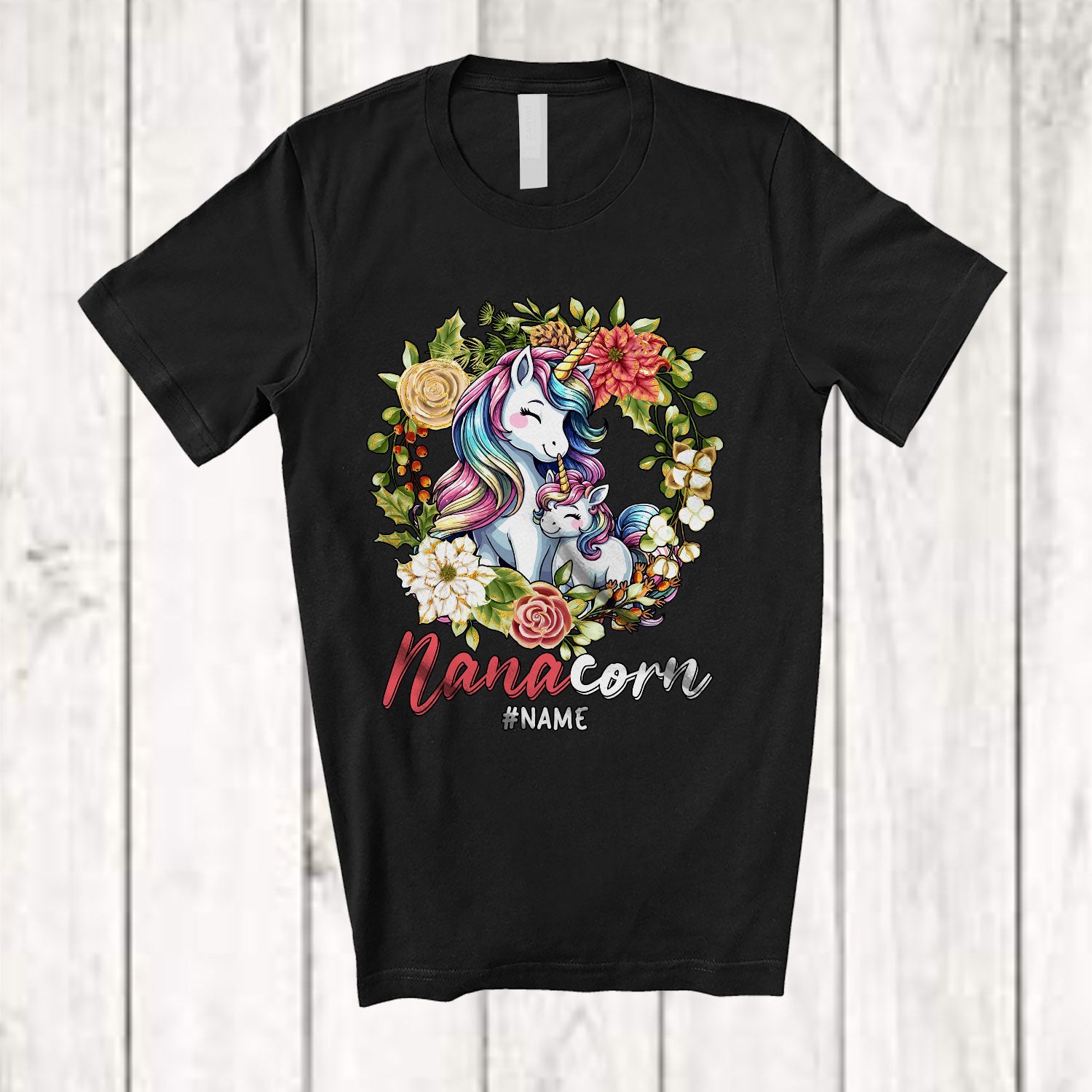 • Personalized Nanacorn; Lovely Mother's Day Flowers Custom Name Nana And Baby Unicorn; Family T-Shirt. This cotton t-shirt is a durable staple product with a classic fit. One of the most popular items, it has a relaxed style made for everyday and casual wear.