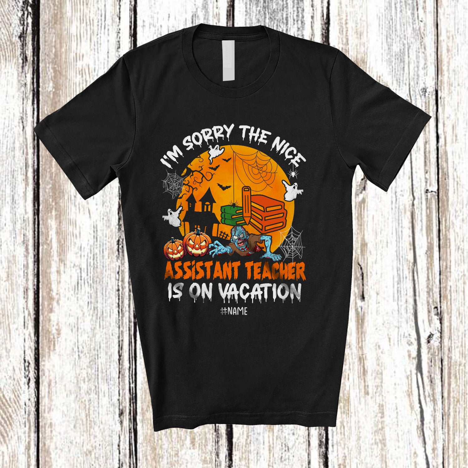 Personalized Nice Assistant Teacher Is On Vacation; Joyful Halloween Zombie; Custom Name Jobs T-Shirt. This cotton t-shirt is a durable staple product with a classic fit. One of the most popular items, it has a relaxed style made for everyday and casual wear.