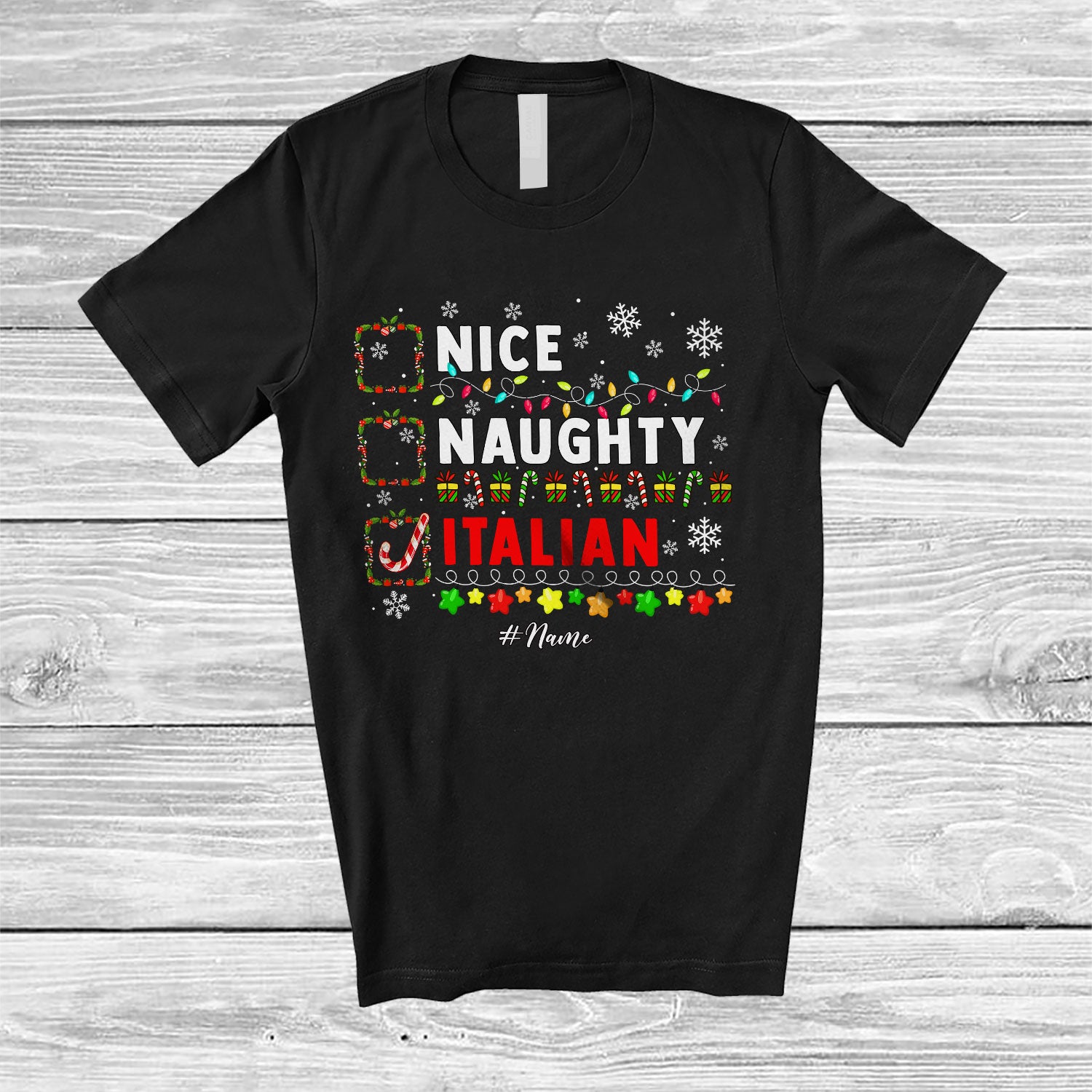 • Personalized Nice Naughty Italian; Joyful Christmas Custom Name Family; X-mas Lights Santa T-Shirt. This cotton t-shirt is a durable staple product with a classic fit. One of the most popular items, it has a relaxed style made for everyday and casual wear.