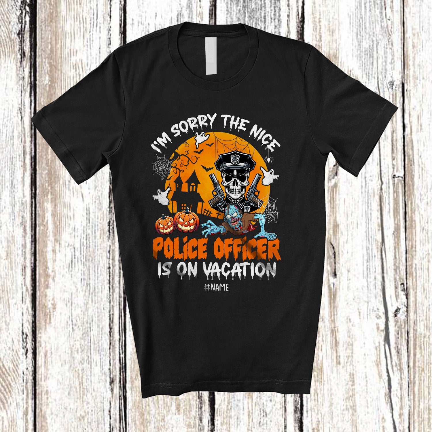 Personalized Nice Police Officer Is On Vacation; Joyful Halloween Zombie Pumpkin; Custom Name Jobs T-Shirt. This cotton t-shirt is a durable staple product with a classic fit. One of the most popular items, it has a relaxed style made for everyday and casual wear.