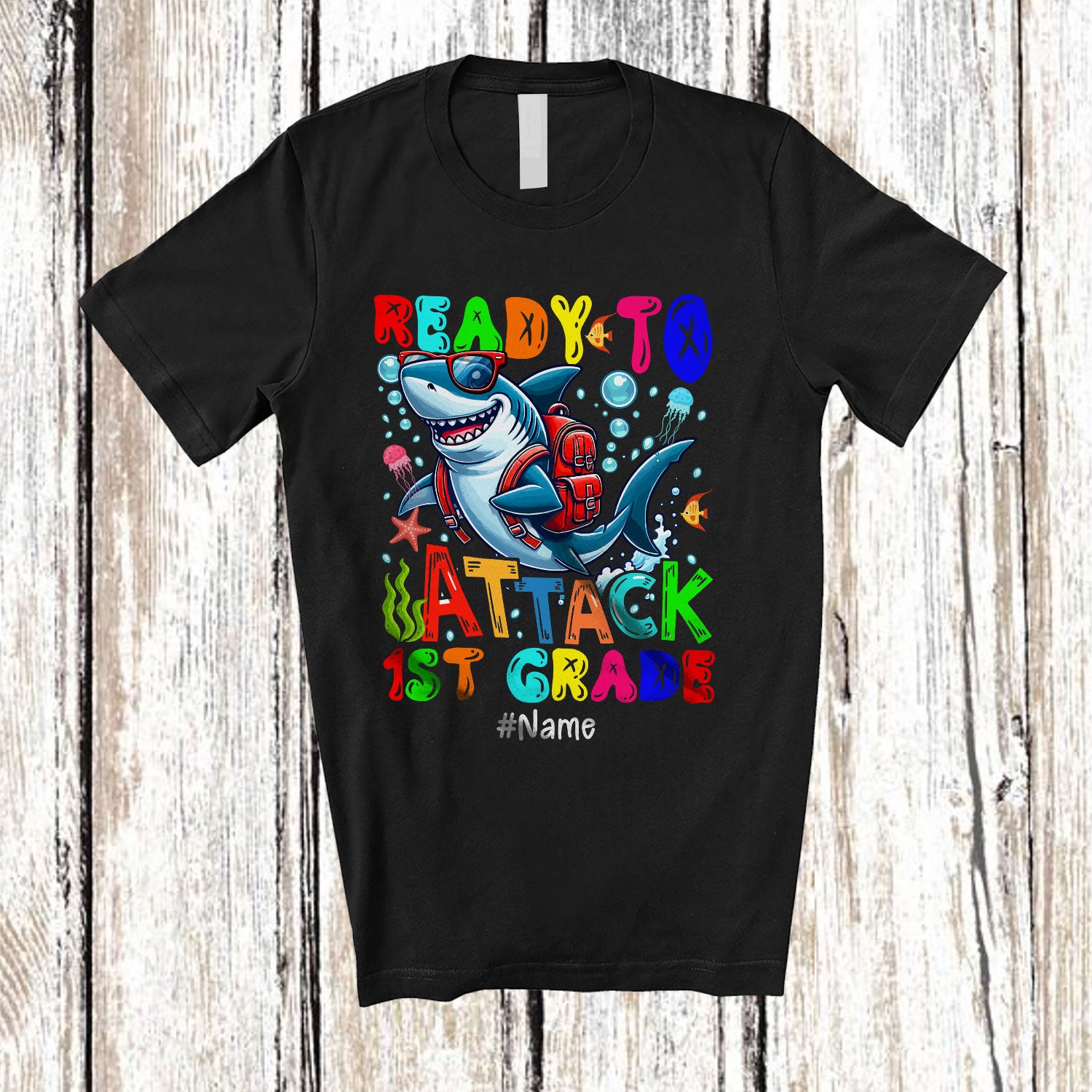 Personalized Ready To Attack 1st Grade; Joyful 100th Day Of School Custom Name Shark Glasses T-Shirt