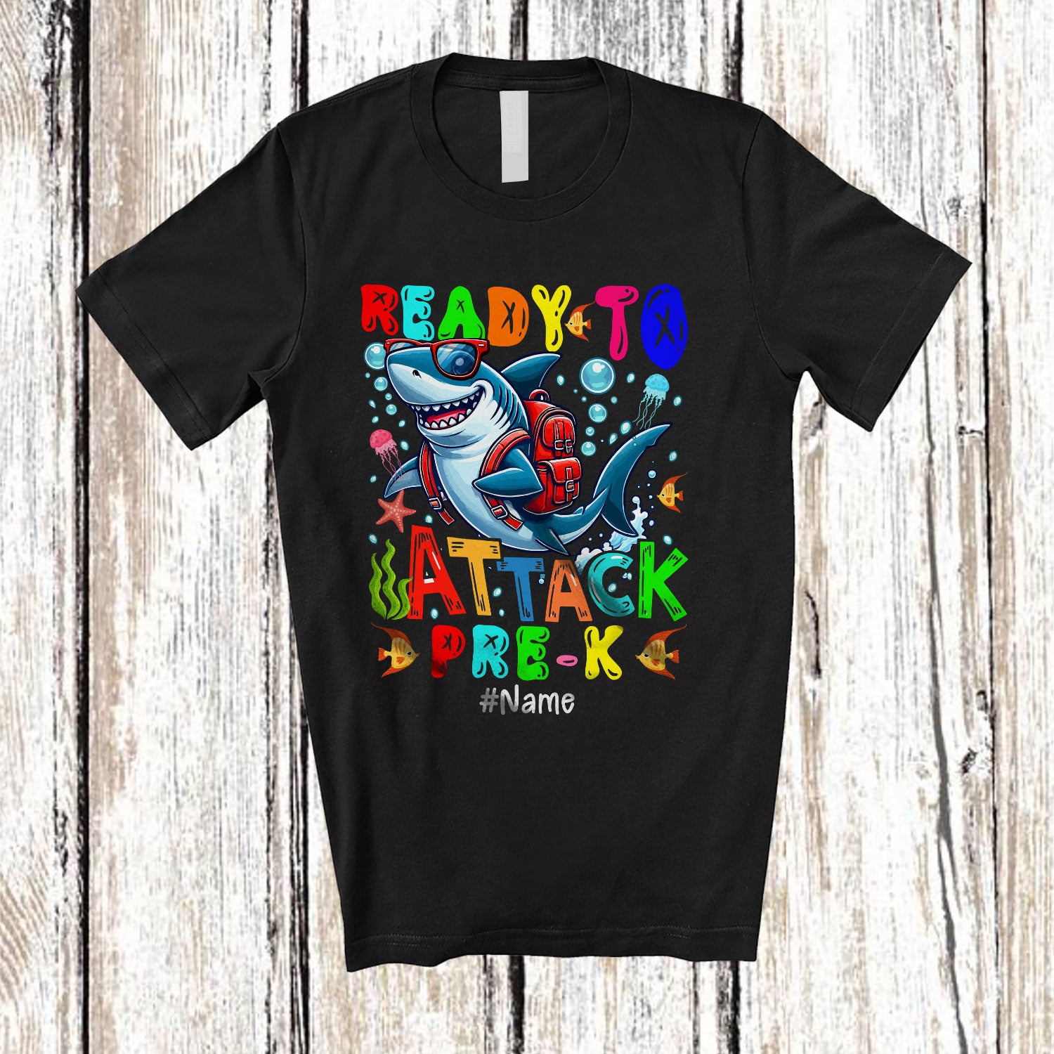 • Personalized Ready To Attack Pre-K; Joyful 100th Day Of School Custom Name Shark Glasses T-Shirt. This cotton t-shirt is a durable staple product with a classic fit. One of the most popular items, it has a relaxed style made for everyday and casual wear.