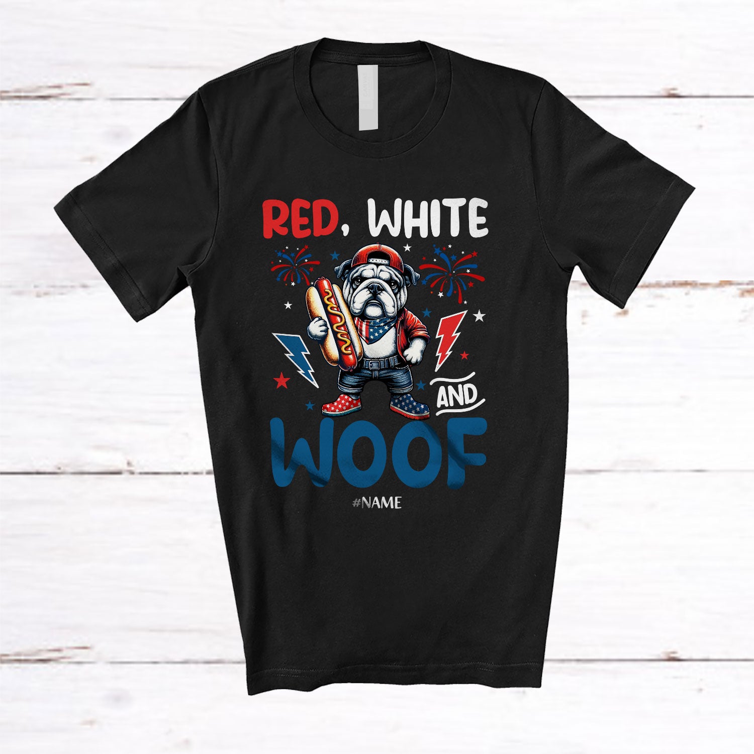 Personalized Red White And Woof; Lovely 4th Of July Custom Name Bulldog Hot Dog; Patriotic T-Shirt