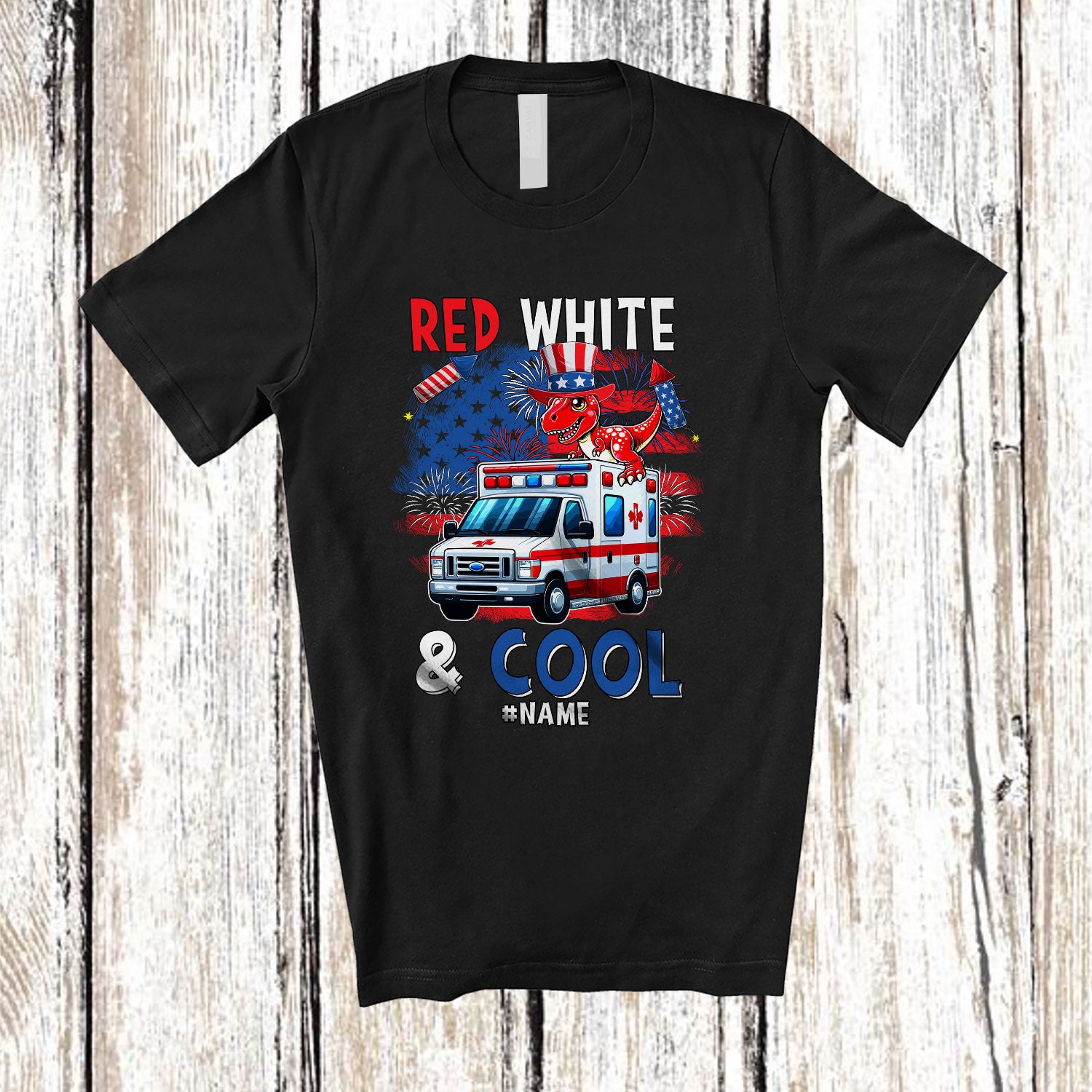 Personalized Red White & Cool; Lovely 4th Of July Custom Name T-Rex On Ambulance; Patriotic T-Shirt