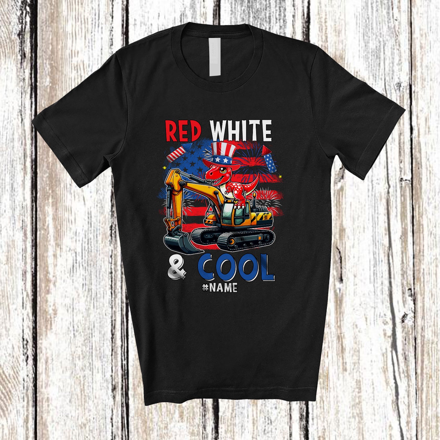 Personalized Red White & Cool; Lovely 4th Of July Custom Name T-Rex On Excavator; Patriotic T-Shirt