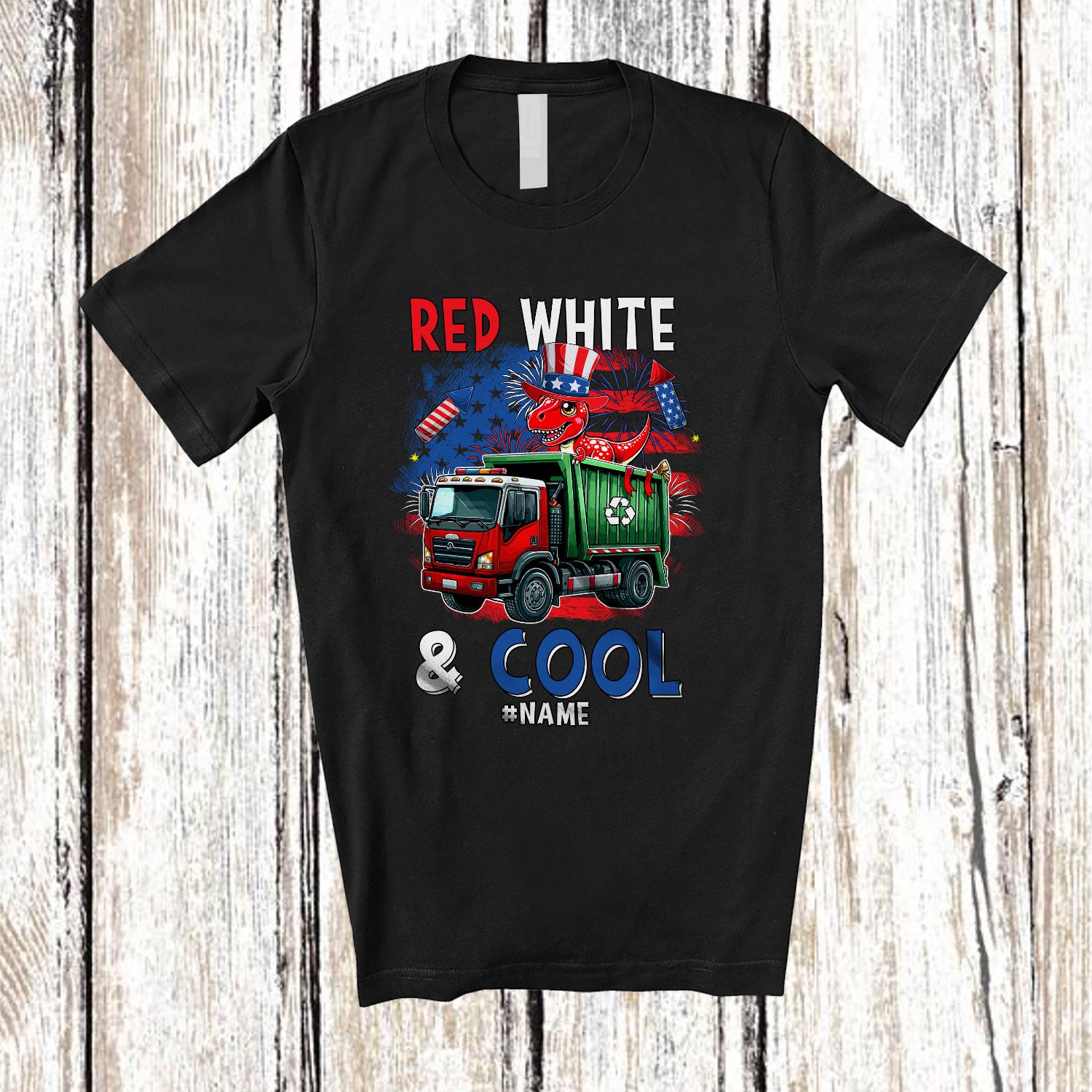 Personalized Red White & Cool; Lovely 4th Of July Custom Name T-Rex On Garbage Truck; Patriotic T-Shirt