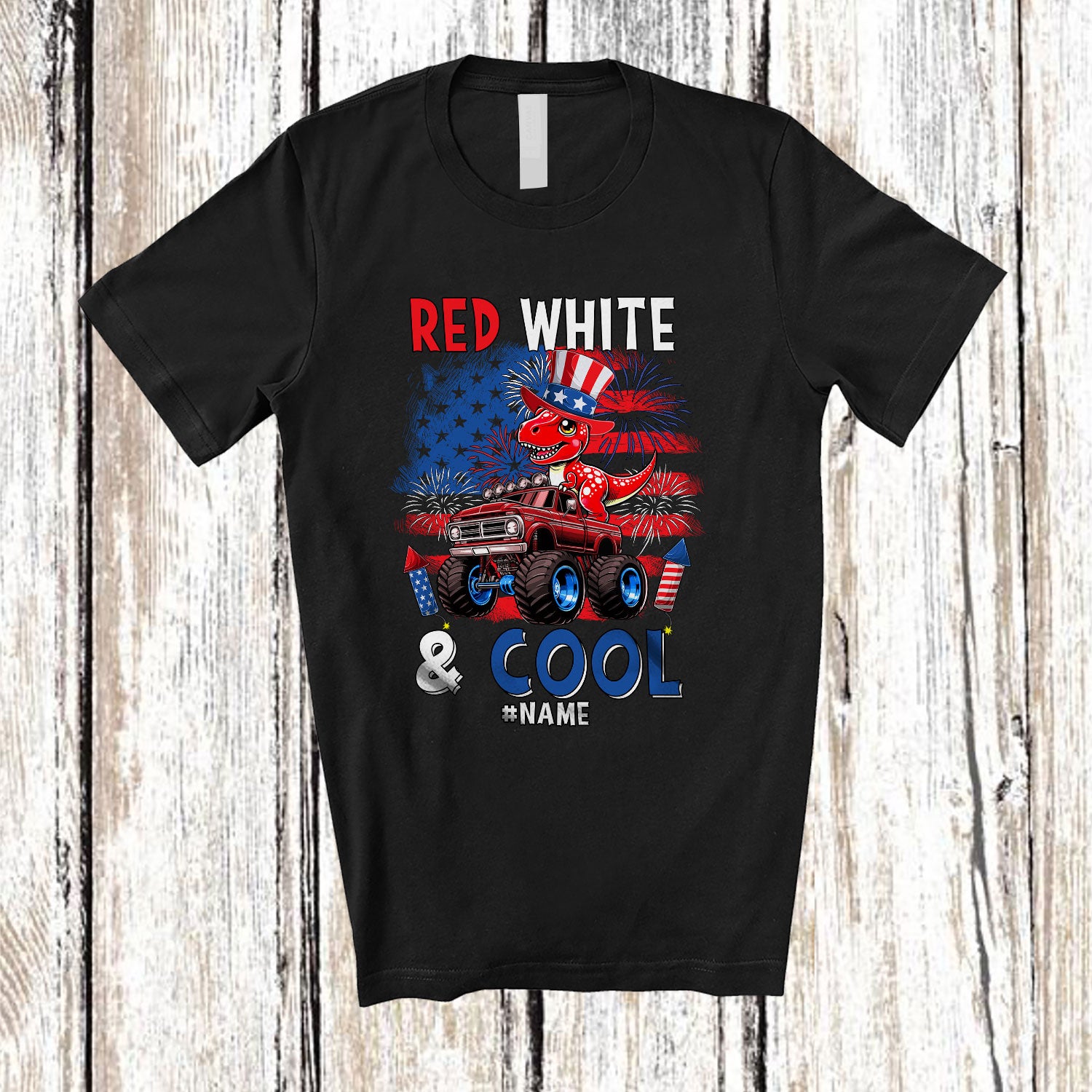 Personalized Red White & Cool; Lovely 4th Of July Custom Name T-Rex On Monster Truck; Patriotic T-Shirt