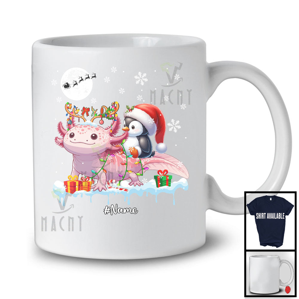 Personalized Santa Penguin Riding Reindeer Axolotl; Awesome Christmas Custom Name Sea Animal T-Shirt