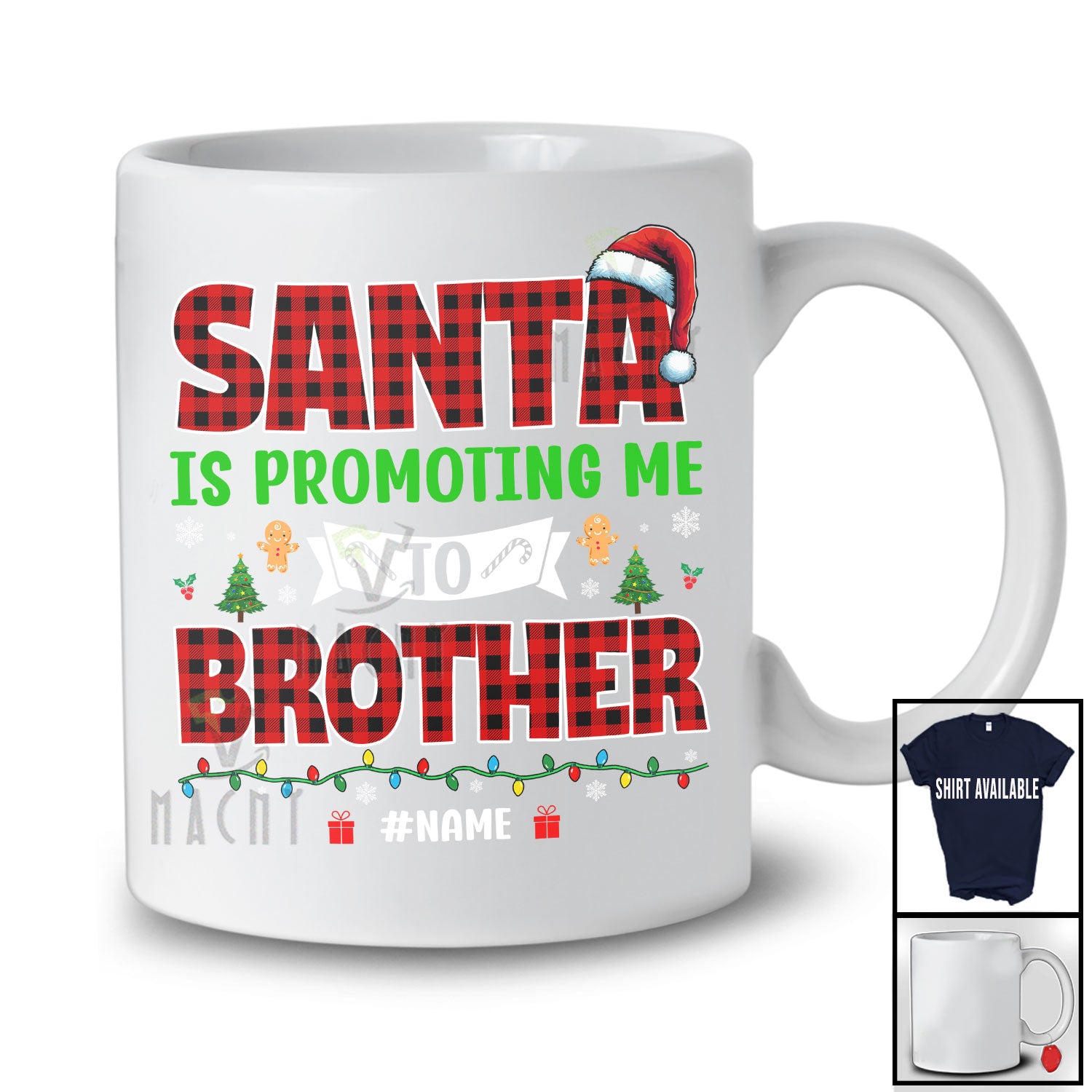 Personalized Santa Promoting Me to Brother; Amusing Christmas Pregnancy; Plaid Custom Name Family T-Shirt. This cotton t-shirt is a durable staple product with a classic fit. One of the most popular items, it has a relaxed style made for everyday and casual wear.
