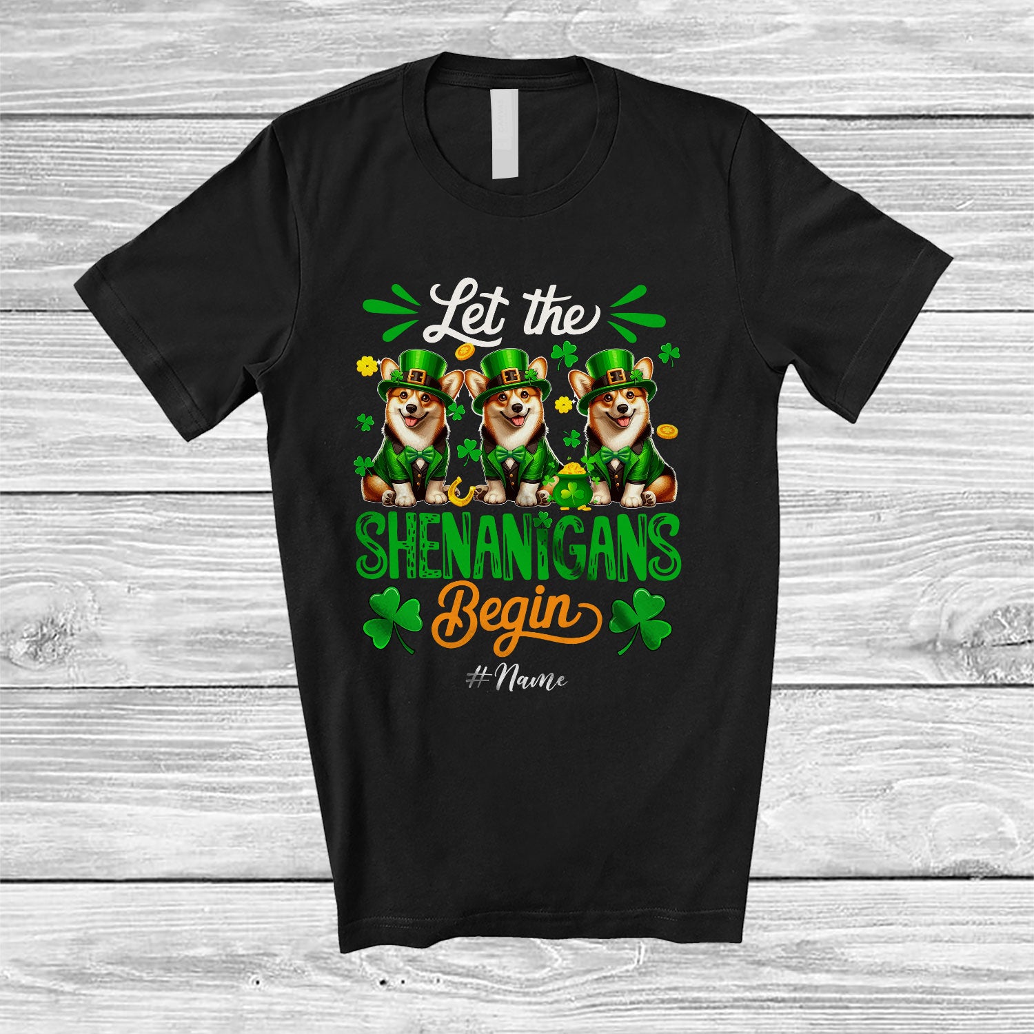 Personalized Shenanigans Begin; Amusing St. Patrick's Day Custom Name Three Corgis Leprechaun T-Shirt