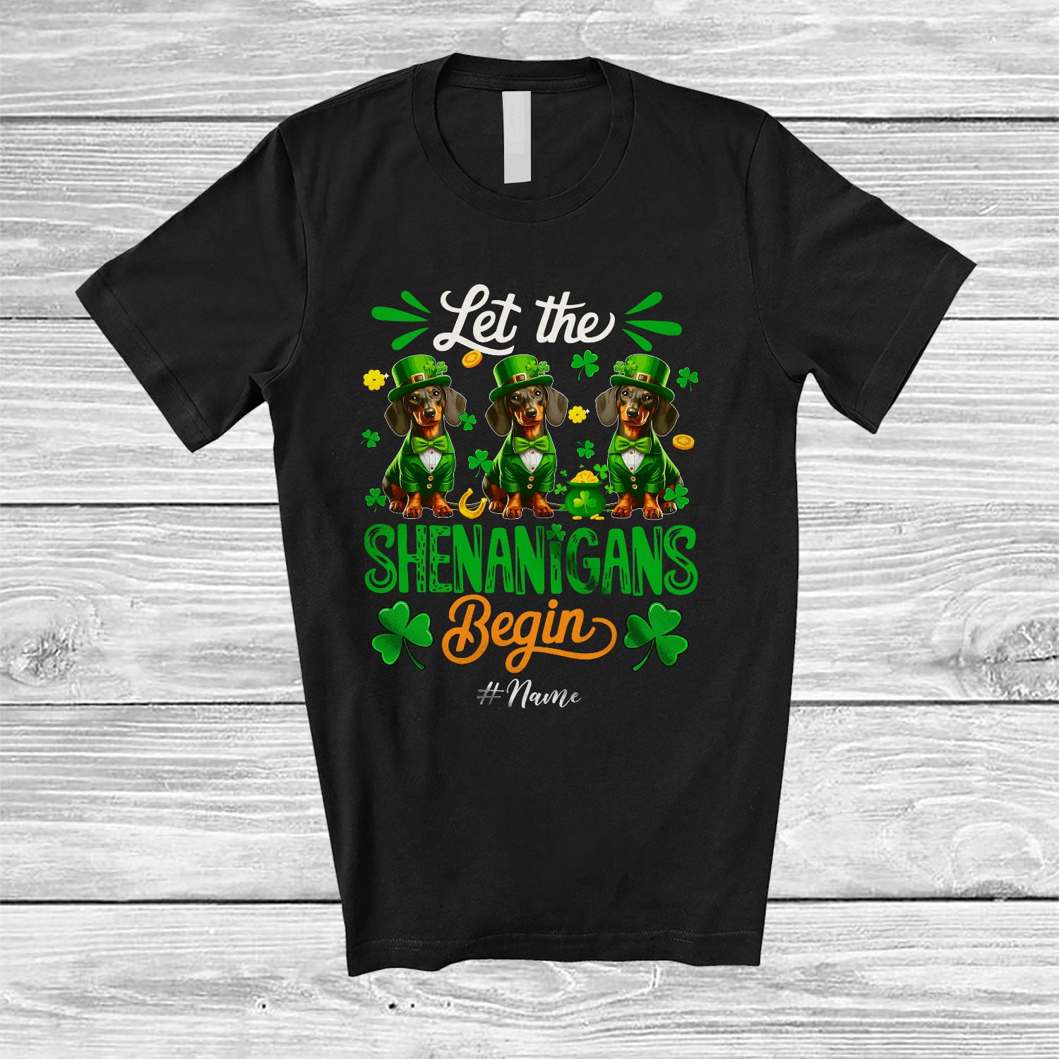 • Personalized Shenanigans Begin; Amusing St. Patrick's Day Custom Name Three Dachshunds Leprechaun T-Shirt. This cotton t-shirt is a durable staple product with a classic fit. One of the most popular items, it has a relaxed style made for everyday and casual wear.