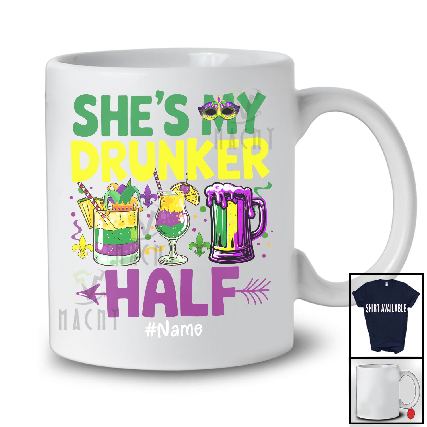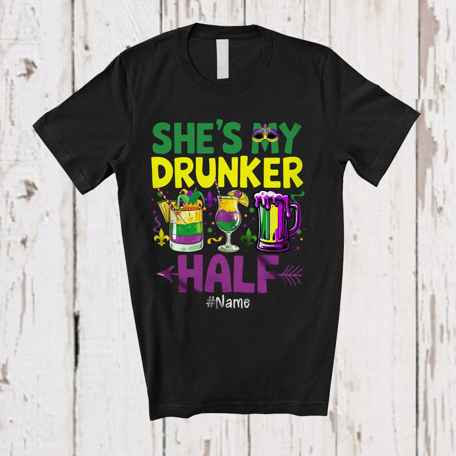Personalized She's My Drunker Half; Wonderful Mardi Gras Custom Name Drinking; Couple Parade T-Shirt. This cotton t-shirt is a durable staple product with a classic fit. One of the most popular items, it has a relaxed style made for everyday and casual wear.