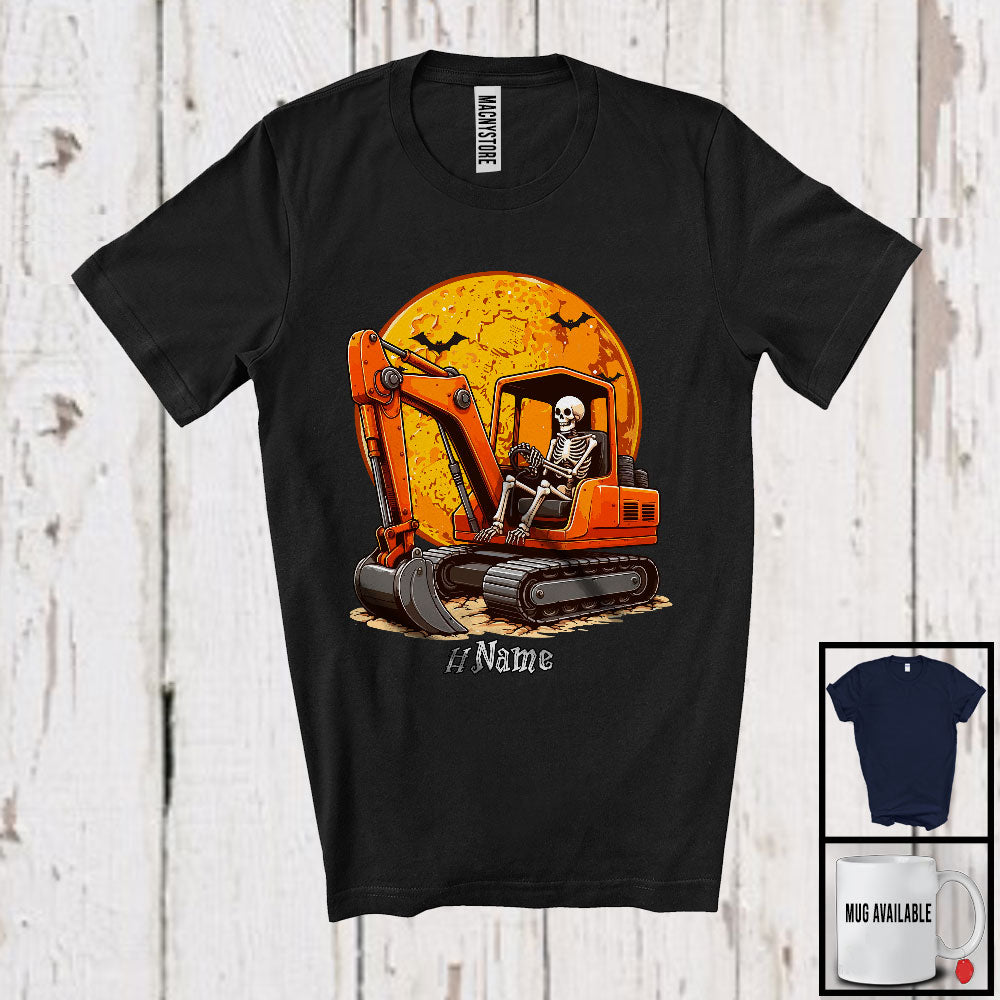 Personalized Skeleton Driving Excavator, Scary Halloween Custom Name Excavator Driver Lover T-Shirt