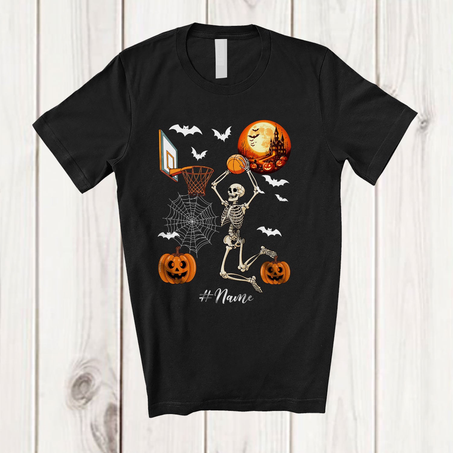 Personalized Skeleton Playing Basketball; Joyful Halloween Moon Custom Name Sport Player Team T-Shirt
