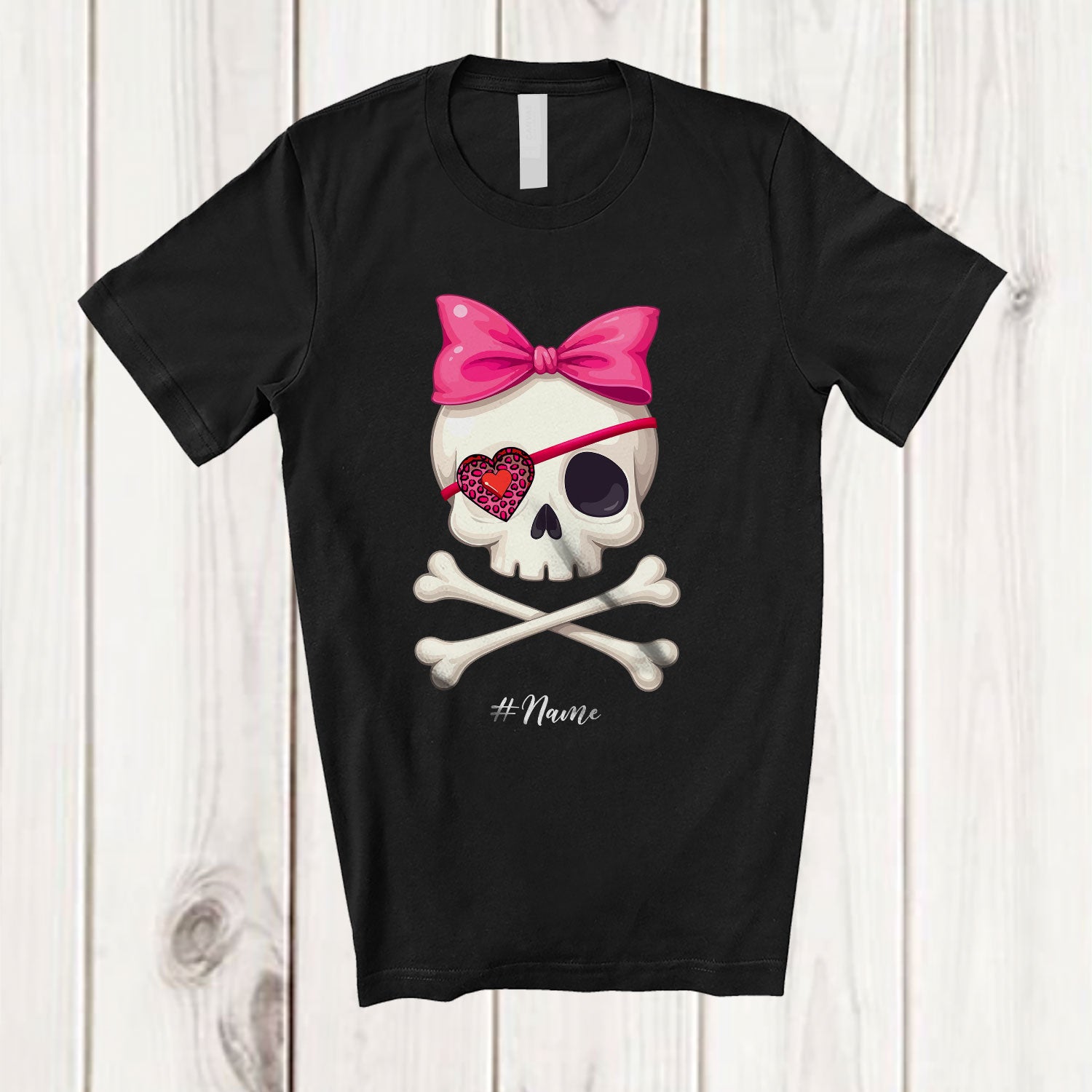 Personalized Skull Pirate; Lovely Valentine Leopard Heart Pirate Skull; Custom Name Girl Couple T-Shirt. This cotton t-shirt is a durable staple product with a classic fit. One of the most popular items, it has a relaxed style made for everyday and casual wear.