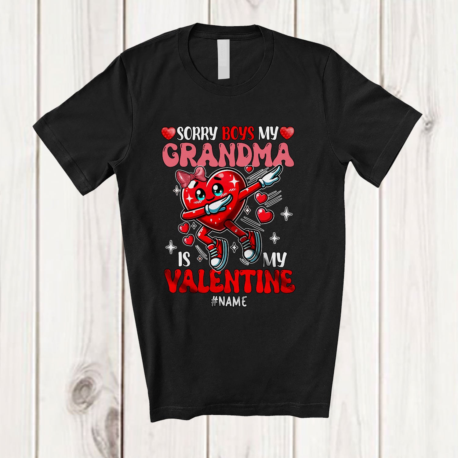 Personalized Sorry Boys My Grandma Is My Valentine; Awesome Custom Name Dabbing Hearts; Family T-Shirt. This cotton t-shirt is a durable staple product with a classic fit. One of the most popular items, it has a relaxed style made for everyday and casual wear.