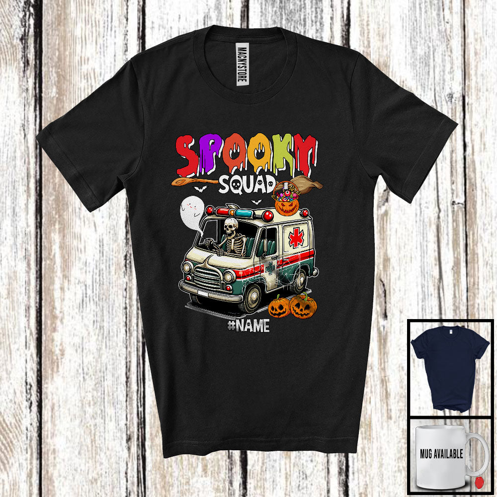 This Personalized Spooky Squad; Scary Halloween Skeleton Driving Ambulance; Custom Name Driver T-Shirt is great idea gift for your family, friends in this birthday, christmas, mother's day, father's day, patrick's day or any holiday.