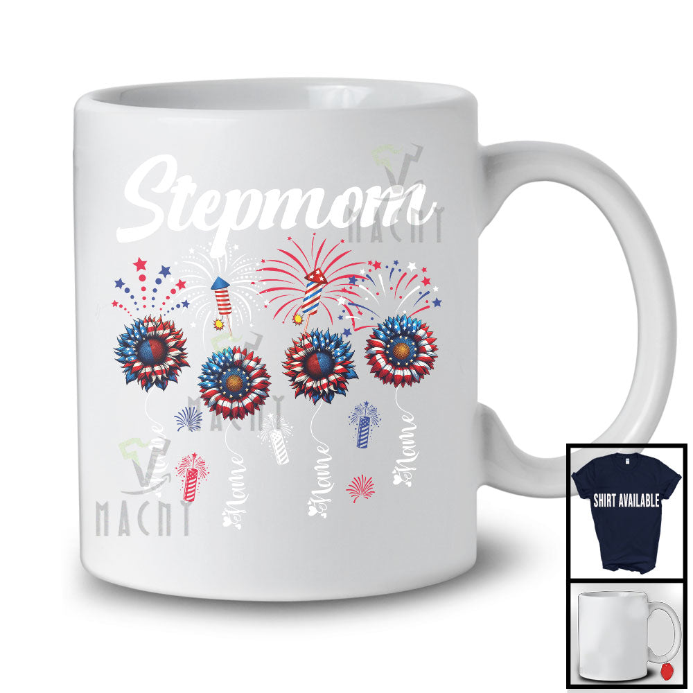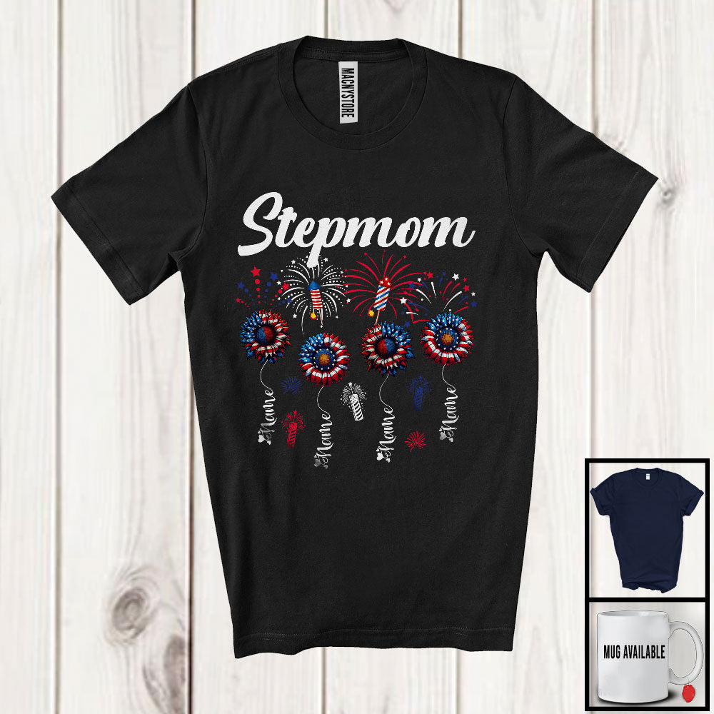 Personalized Stepmom, Amazing 4th Of July Sunflowers, Fireworks Custom Name Family Patriotic T-Shirt